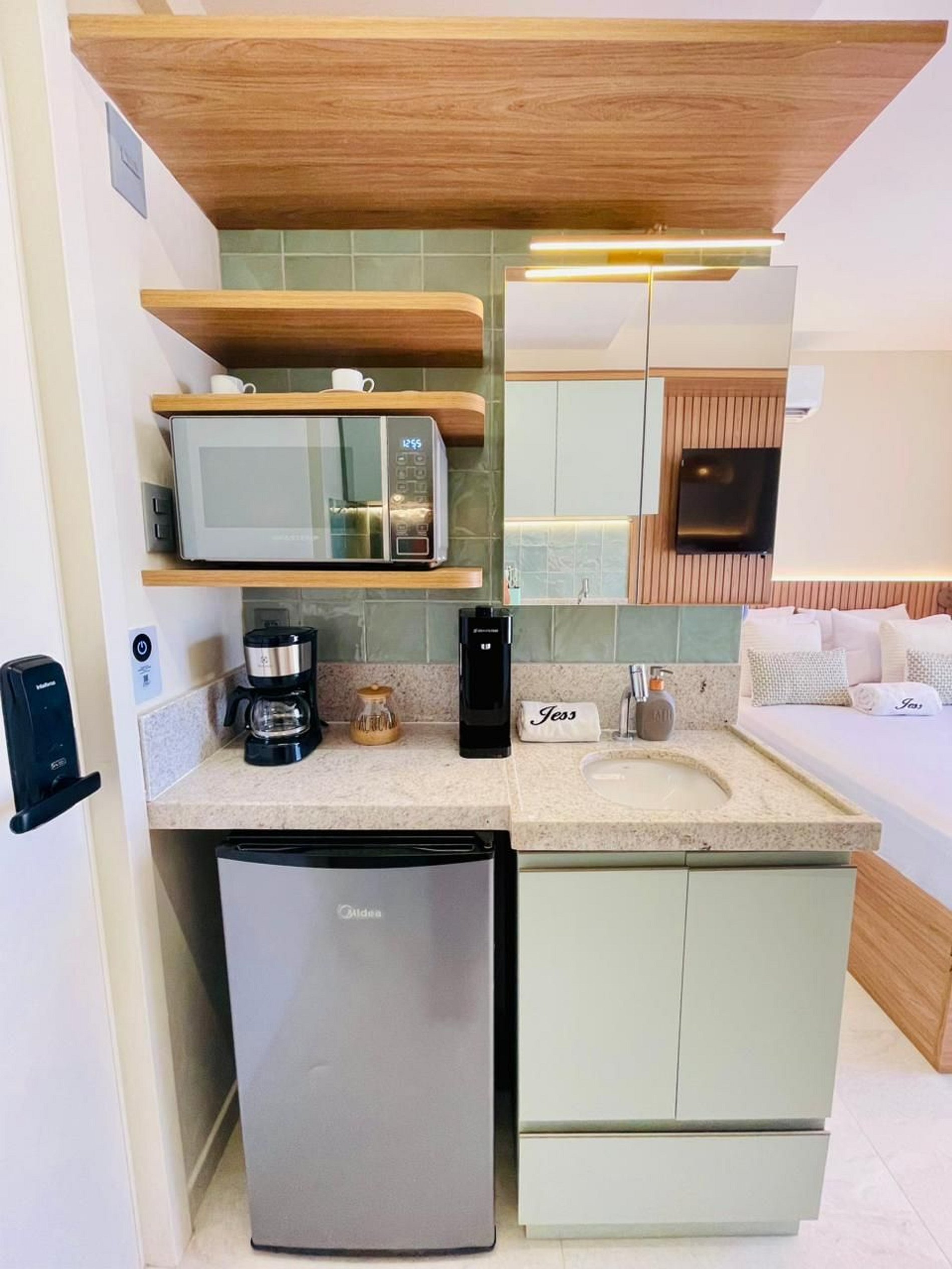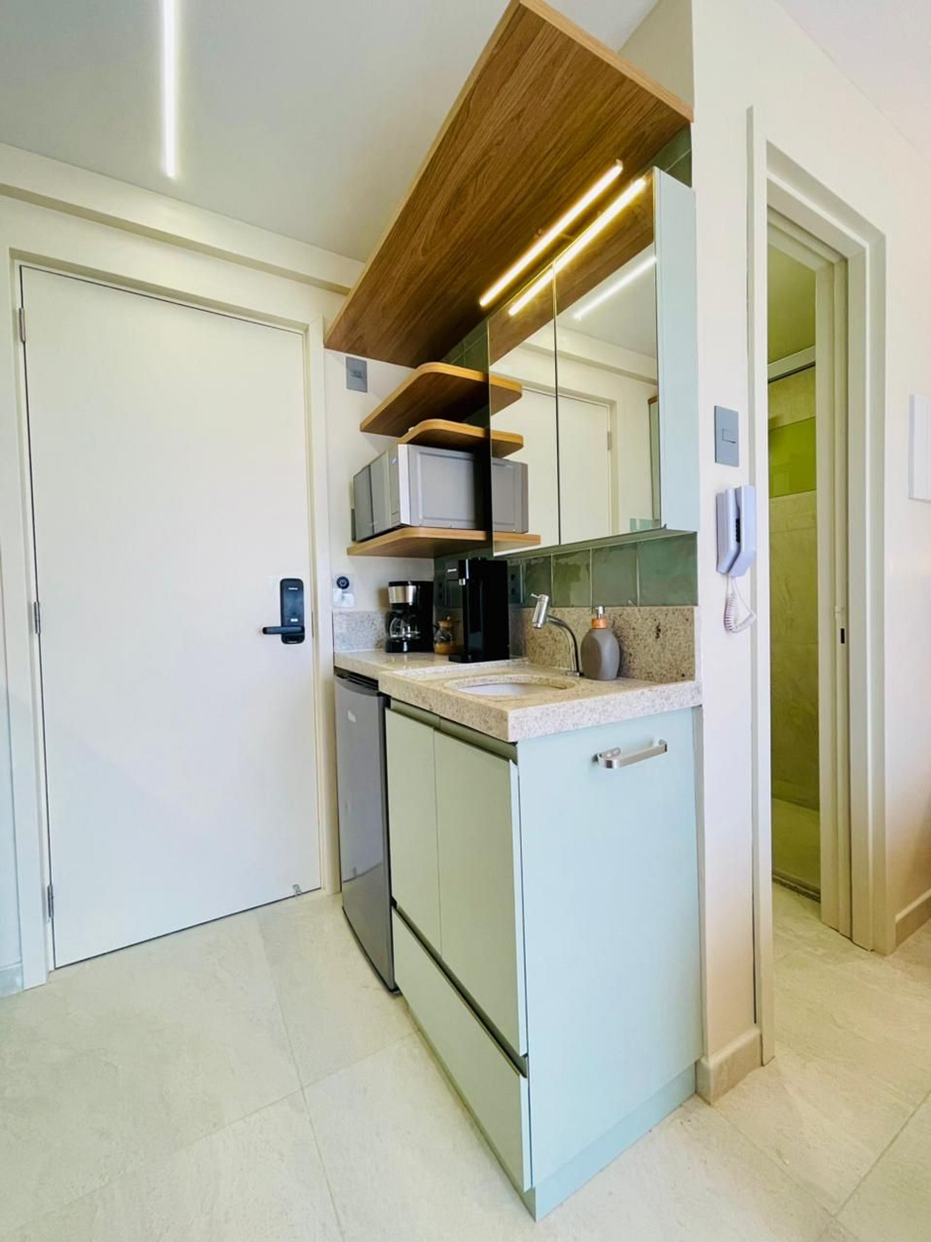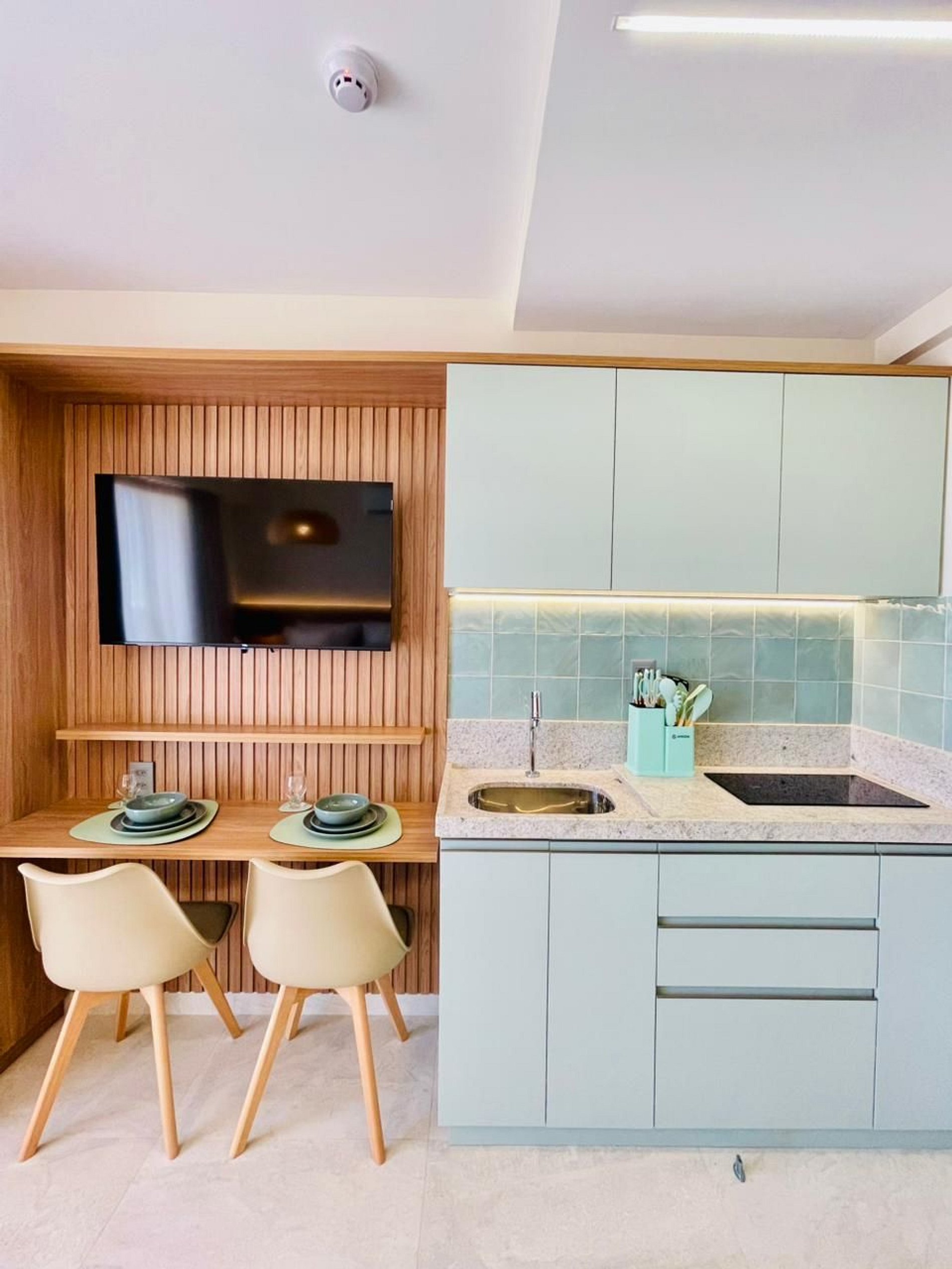 O apartamento é completo, com cozinha equipada (eletrodomésticos e utensílios) para preparar suas refeições com conforto.