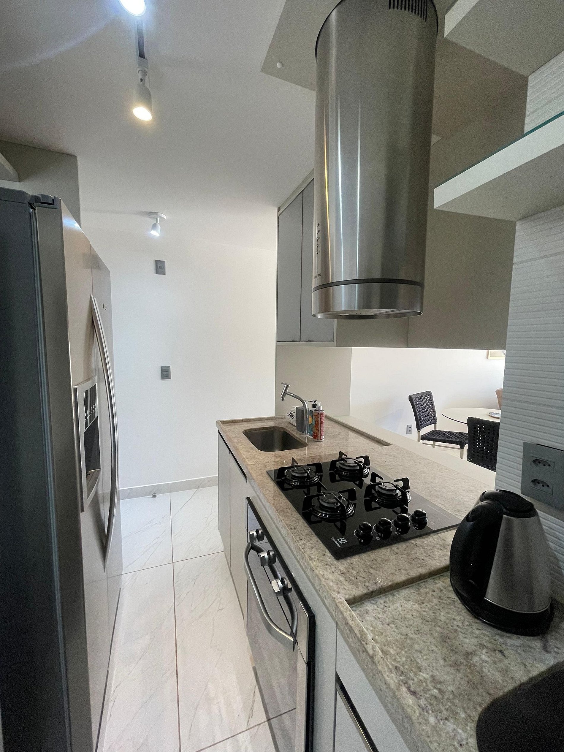 A cozinha integrada é funcional e bem equipada, com cooktop, micro-ondas, geladeira e todos os utensílios que você precisa para preparar refeições no seu ritmo. A sala é um convite ao relaxamento, com TV, ar-condicionado e espaços bem distribuídos.