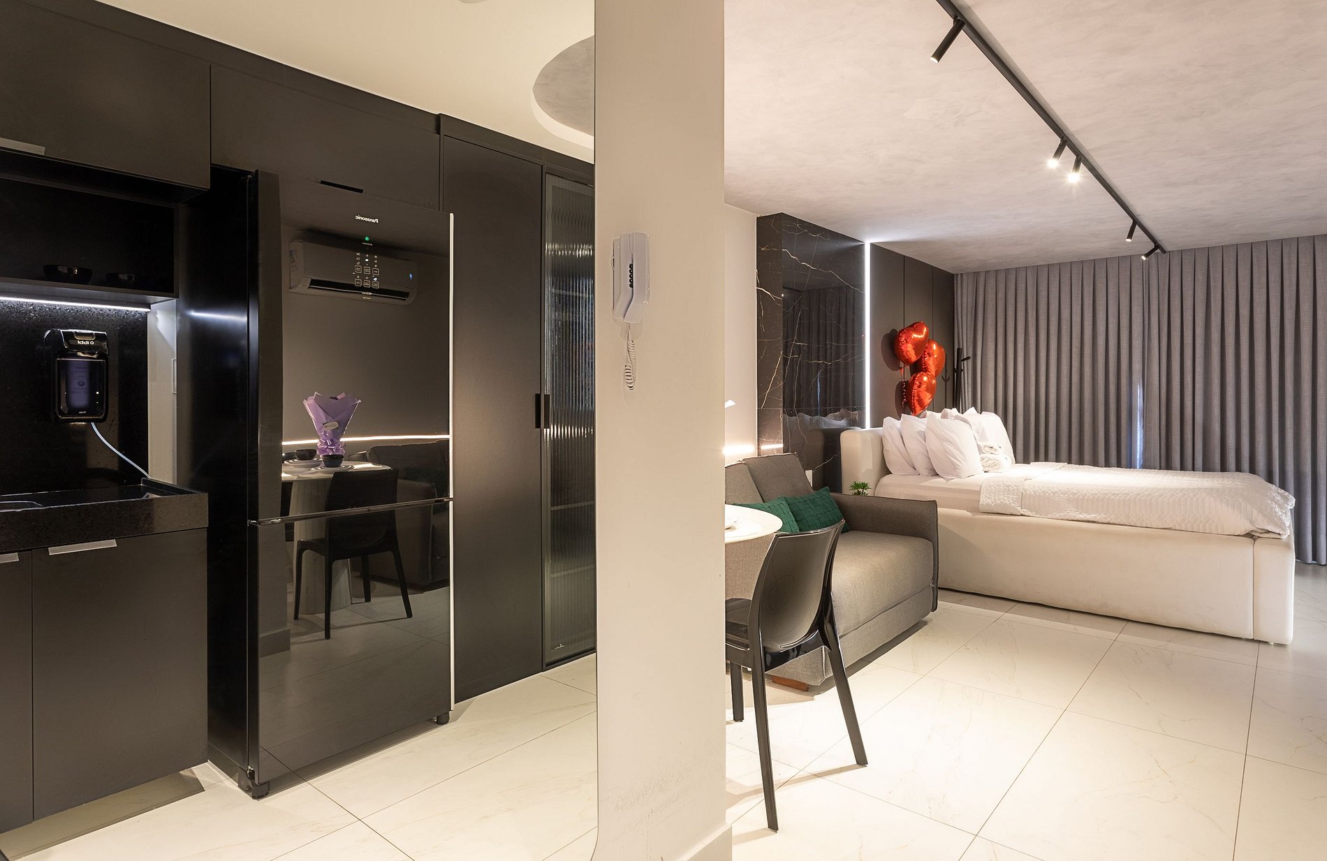 Um ambiente moderno, elegante e bem planejado, com decoração minimalista e acabamento premium — destaque para o design em preto e branco que traz um ar de loft urbano.