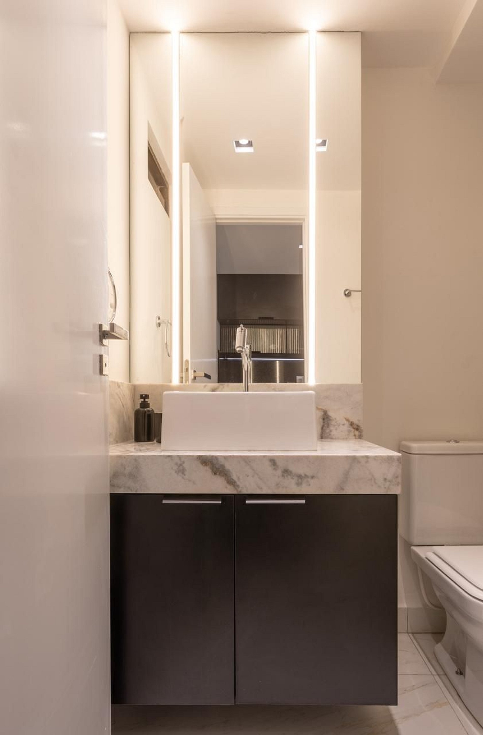 • Banheiro espaçoso com box de vidro, iluminação em LED e acabamento em mármore;