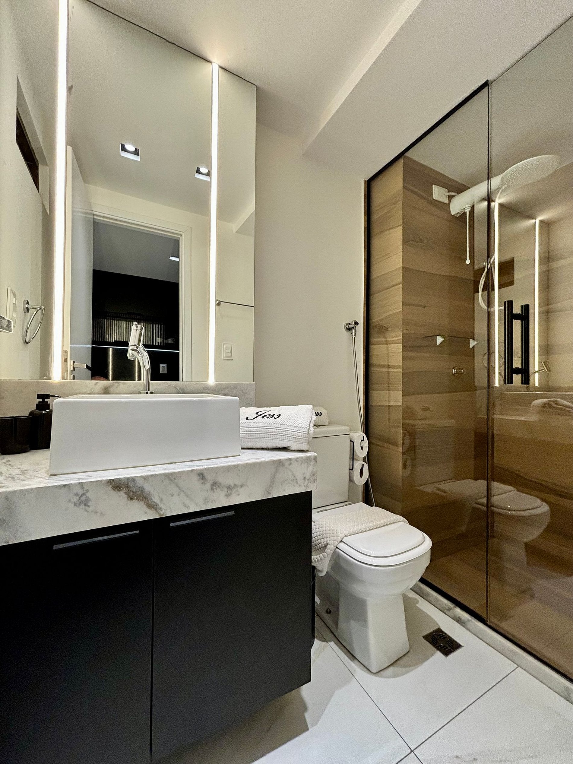 • Banheiro espaçoso com box de vidro, iluminação em LED e acabamento em mármore;