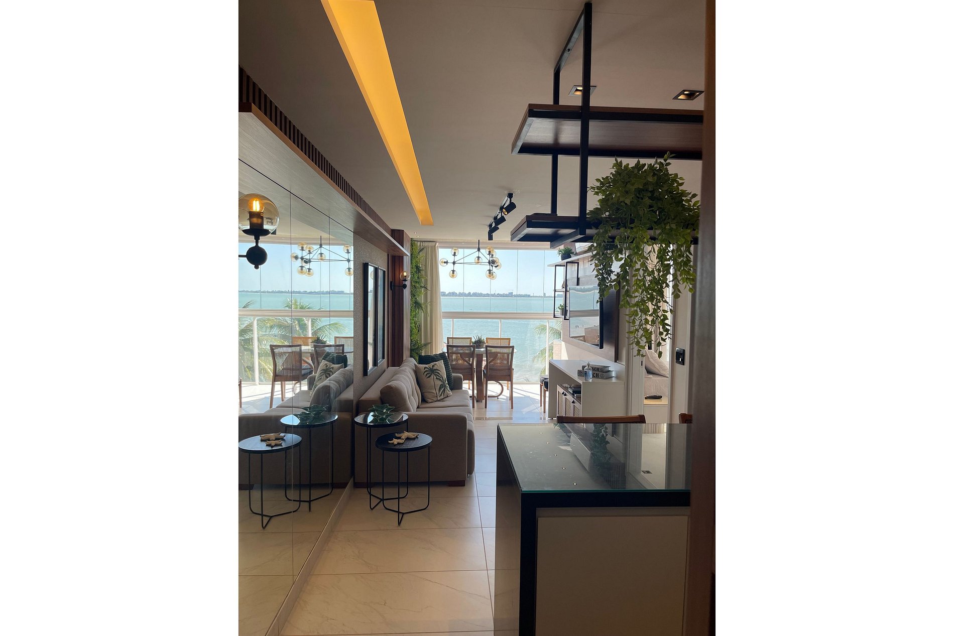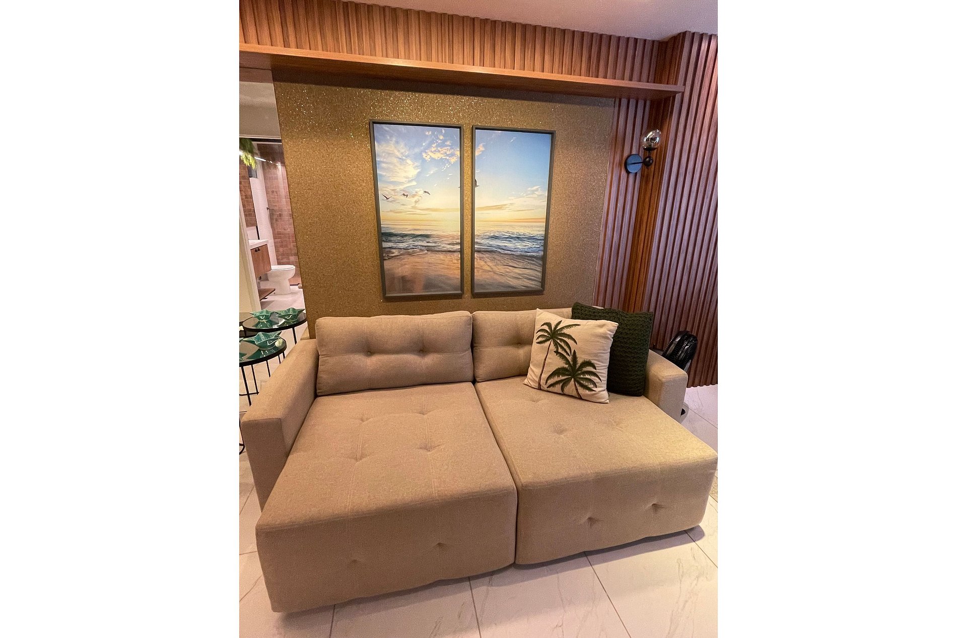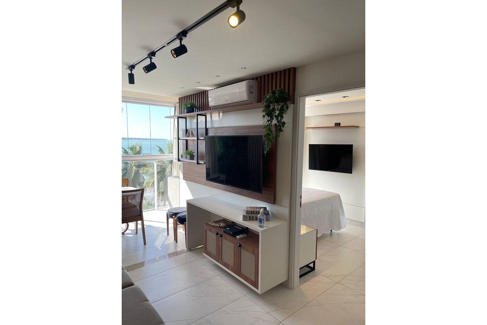• Sala de estar climatizada com ar-condicionado, perfeita para relaxar após um dia de praia.