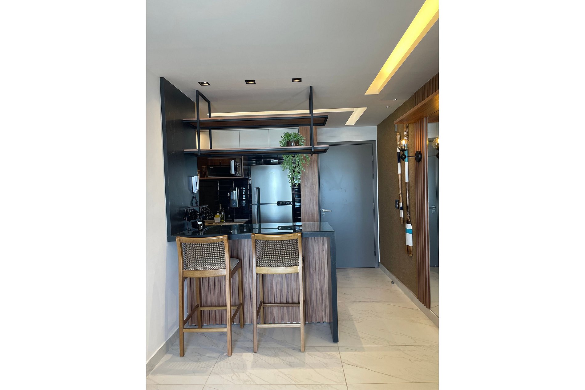 • Cozinha Integrada, Funcional, compacta, moderna e equipada com tudo o que você precisa: geladeira, fogão, forno elétrico e micro-ondas. Além de acessórios básicos para uma estadia completa.