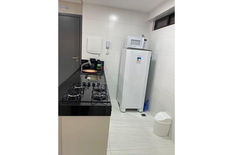 O apartamento é completo, com cozinha equipada (eletrodomésticos e utensílios) para preparar suas refeições com conforto.