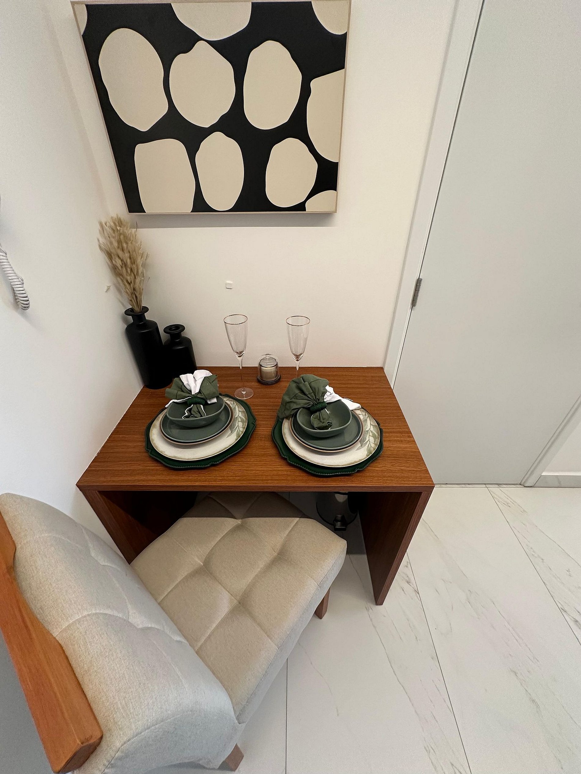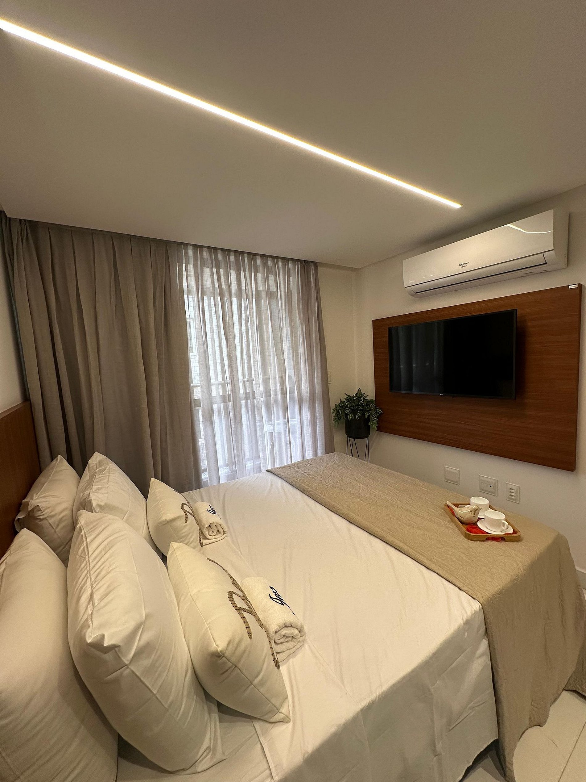 - O flat é super funcional com uma cama queen e sofá cama, guarda-roupa, mesa de apoio.