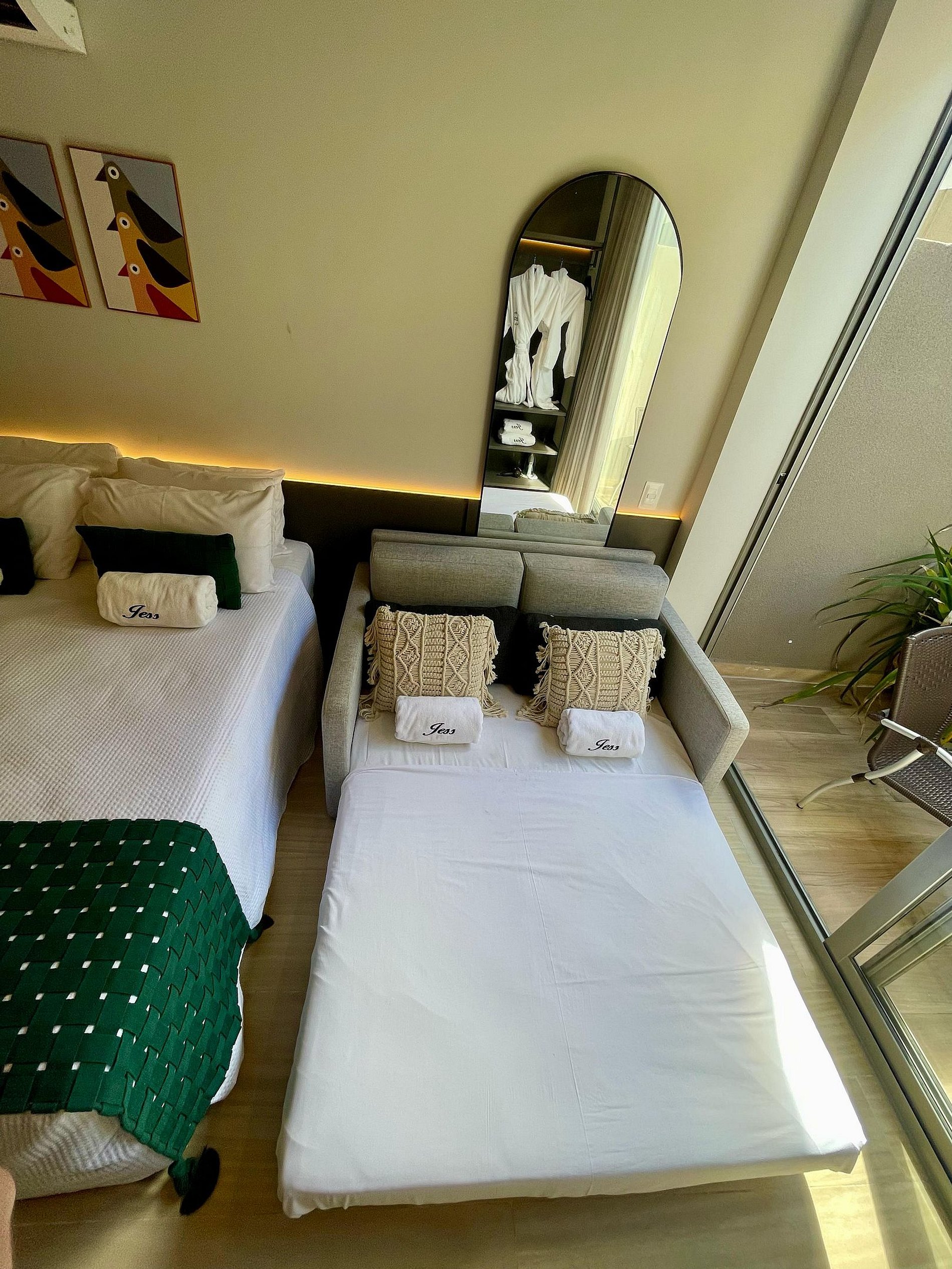 •Sofá-cama de casal – Ideal para receber hóspedes adicionais, mantendo o ambiente funcional, moderno e aconchegante.