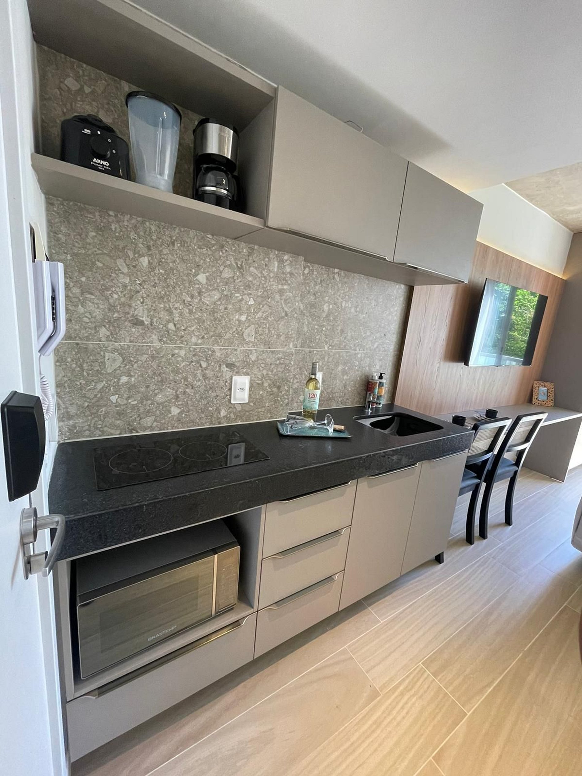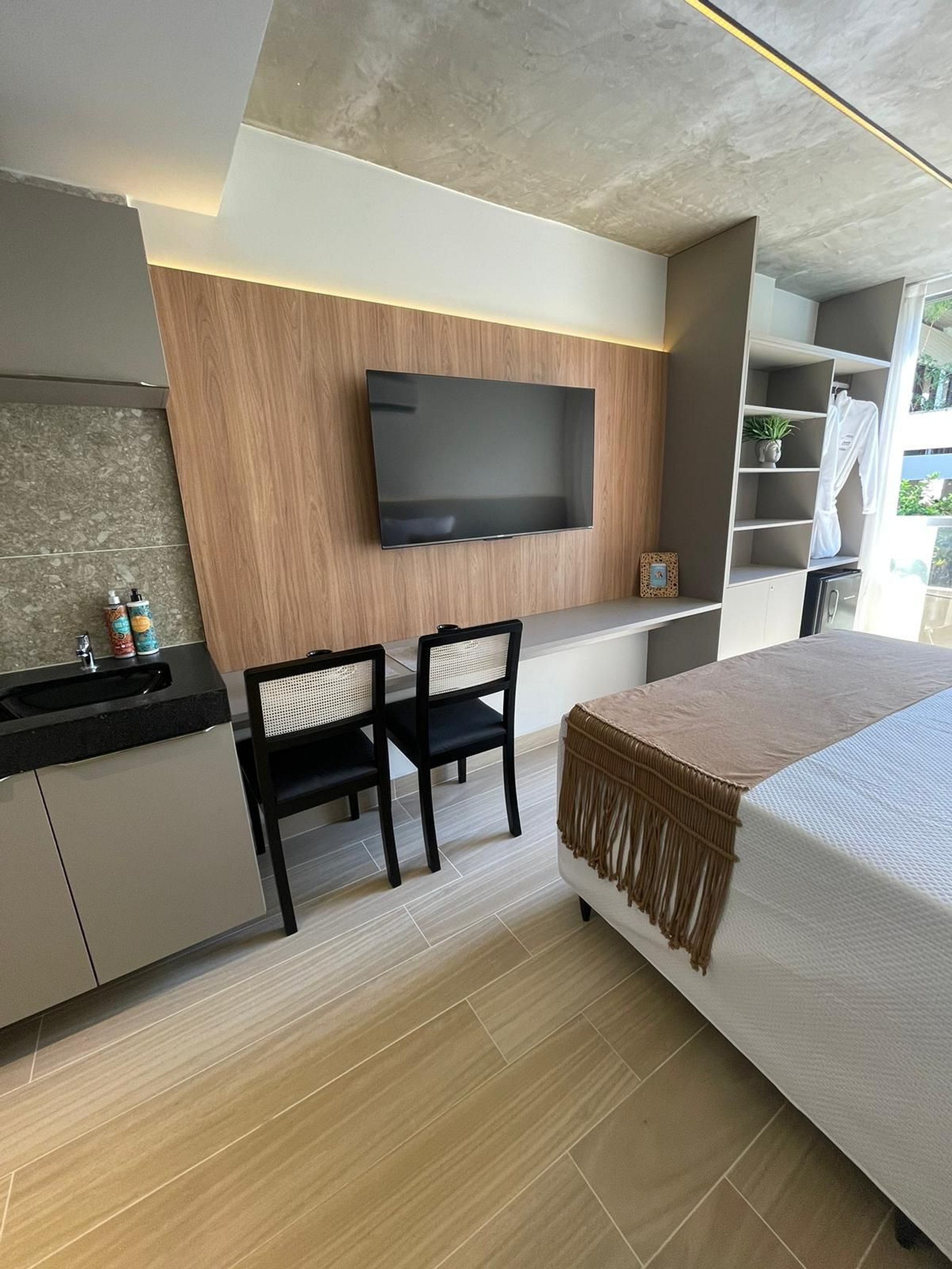 - O flat é super funcional com uma cama queen e sofá cama, mesa de apoio..
