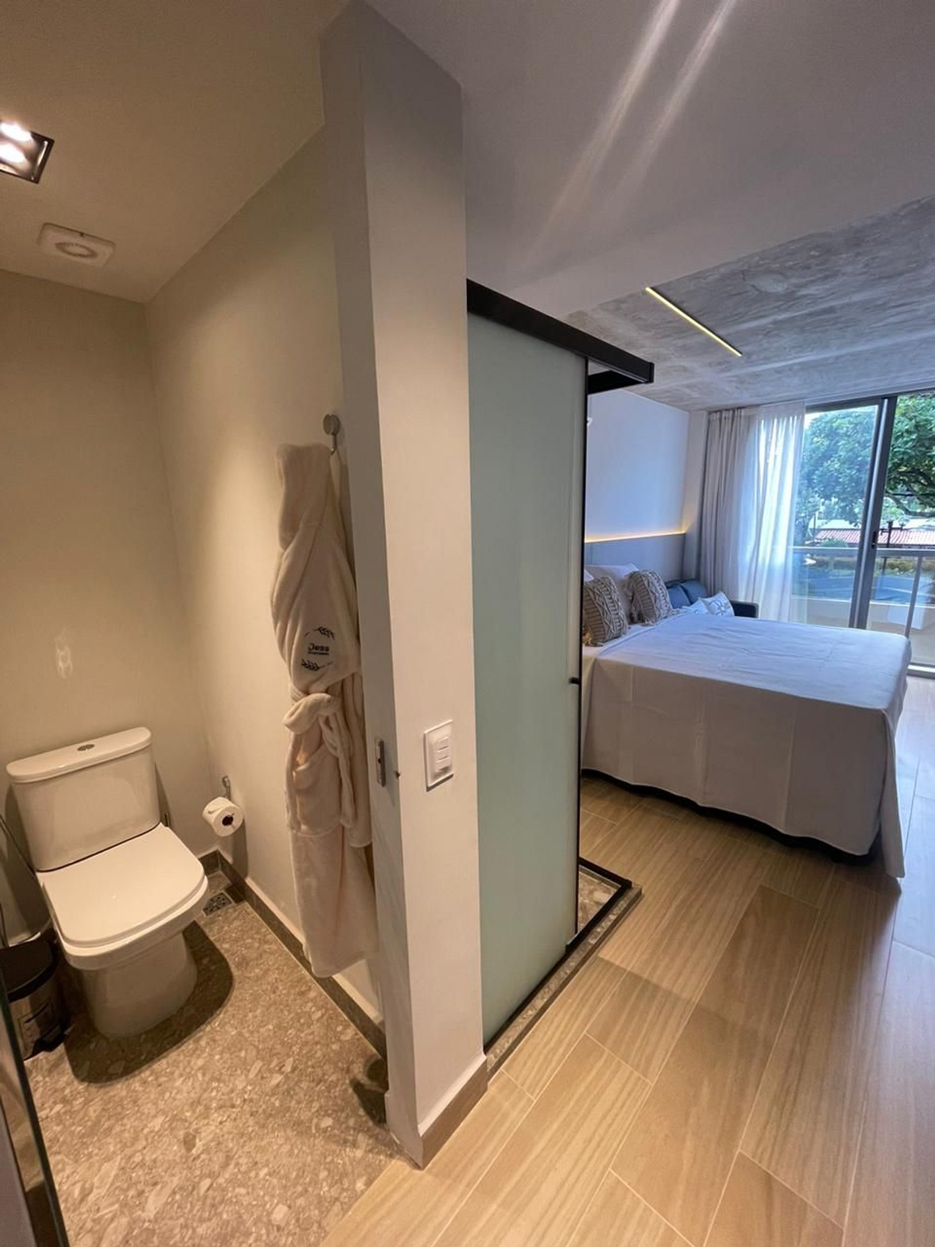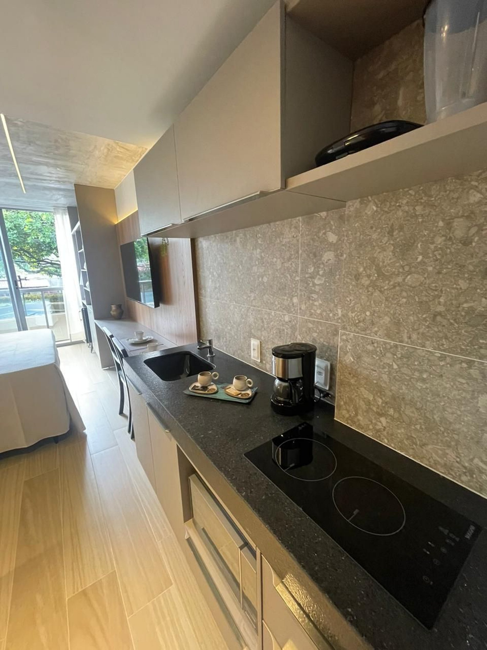 - O flat é super funcional com uma cama queen e sofá cama, mesa de apoio..