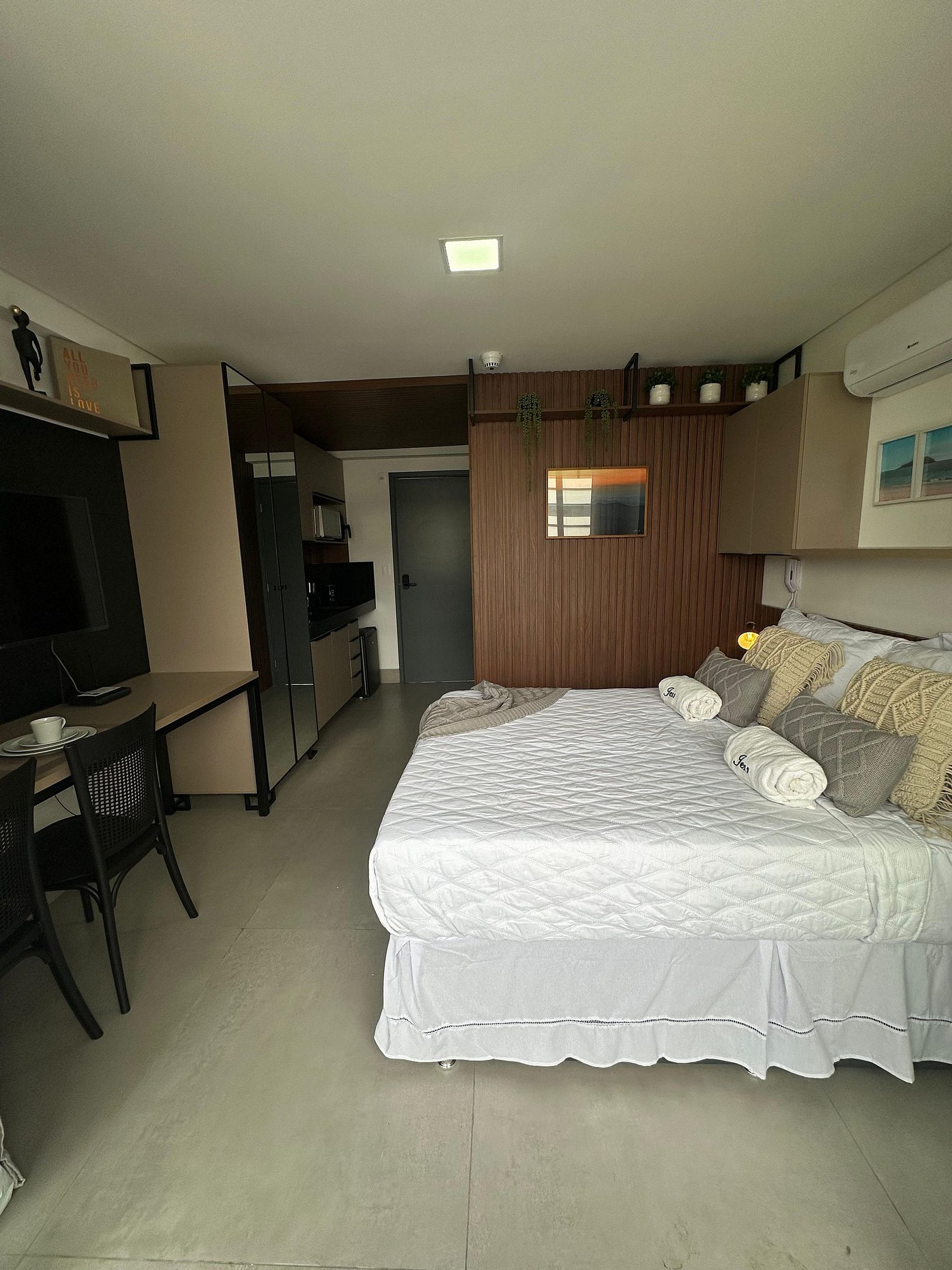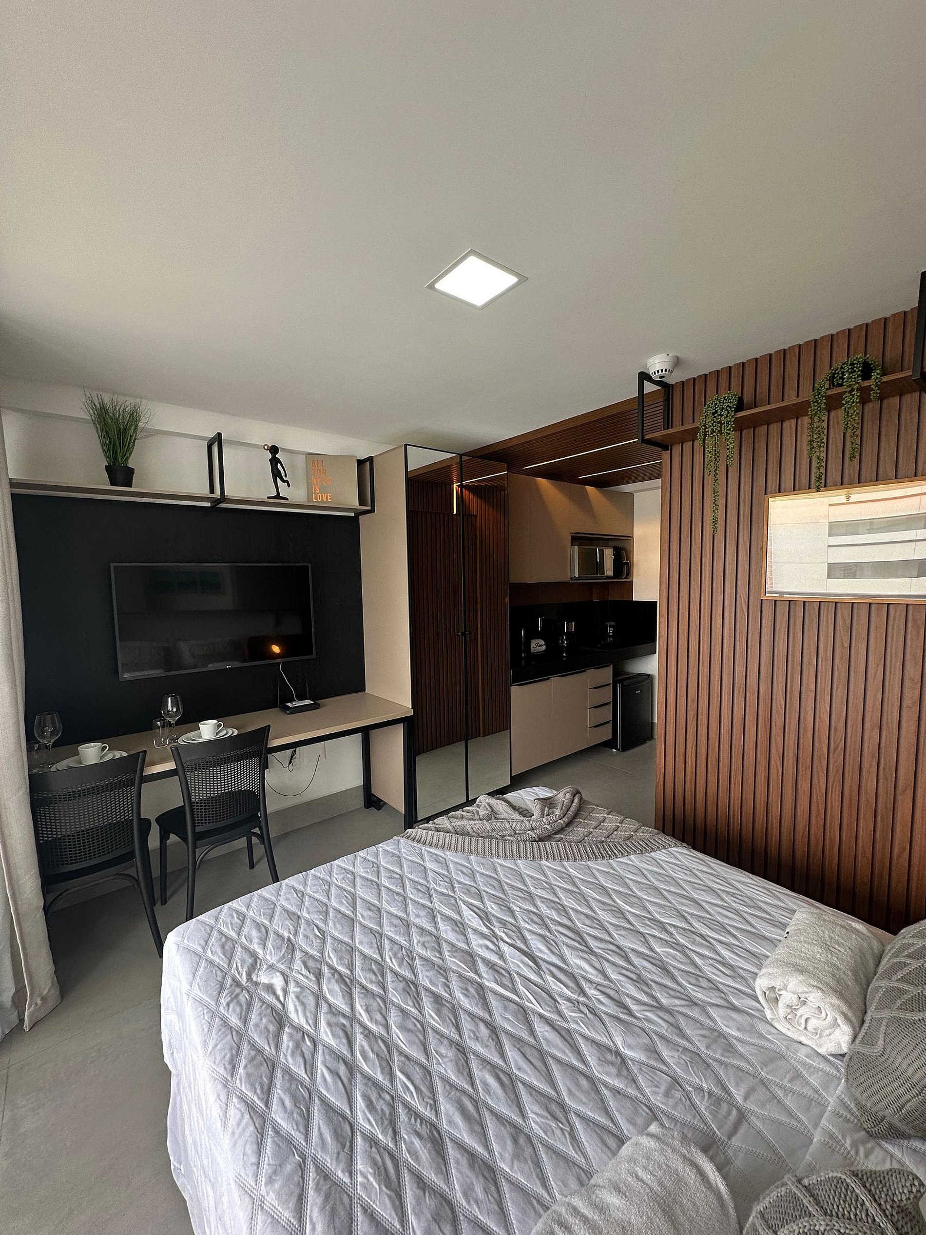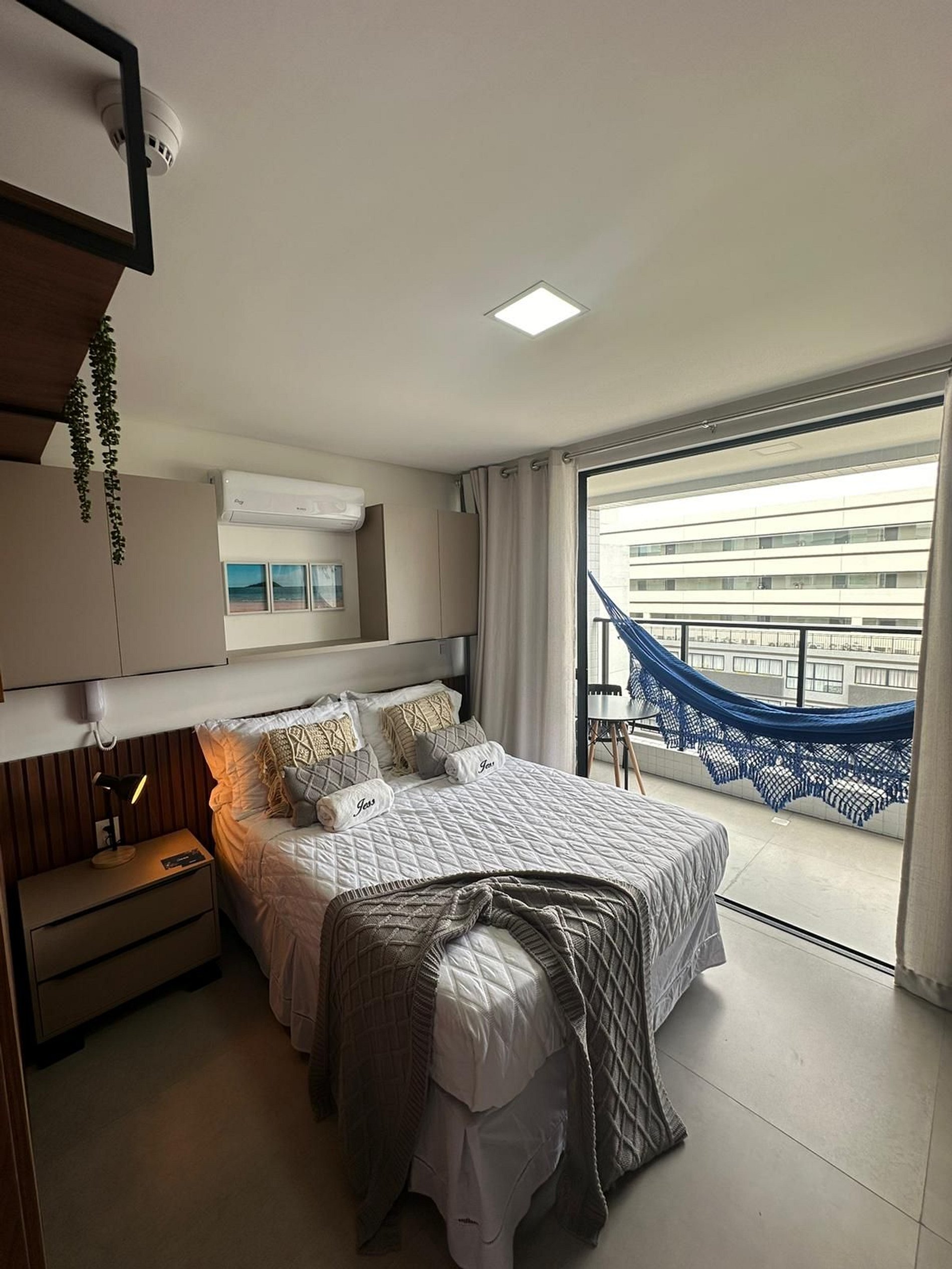 O apartamento é completo, como uma cama super confortável e cama auxiliar, varanda com mesa de apoio e rede para relaxar. Cozinha completa com airfryer, frigobar, cooktop, e todos os utensílios básicos, para preparar suas refeições.