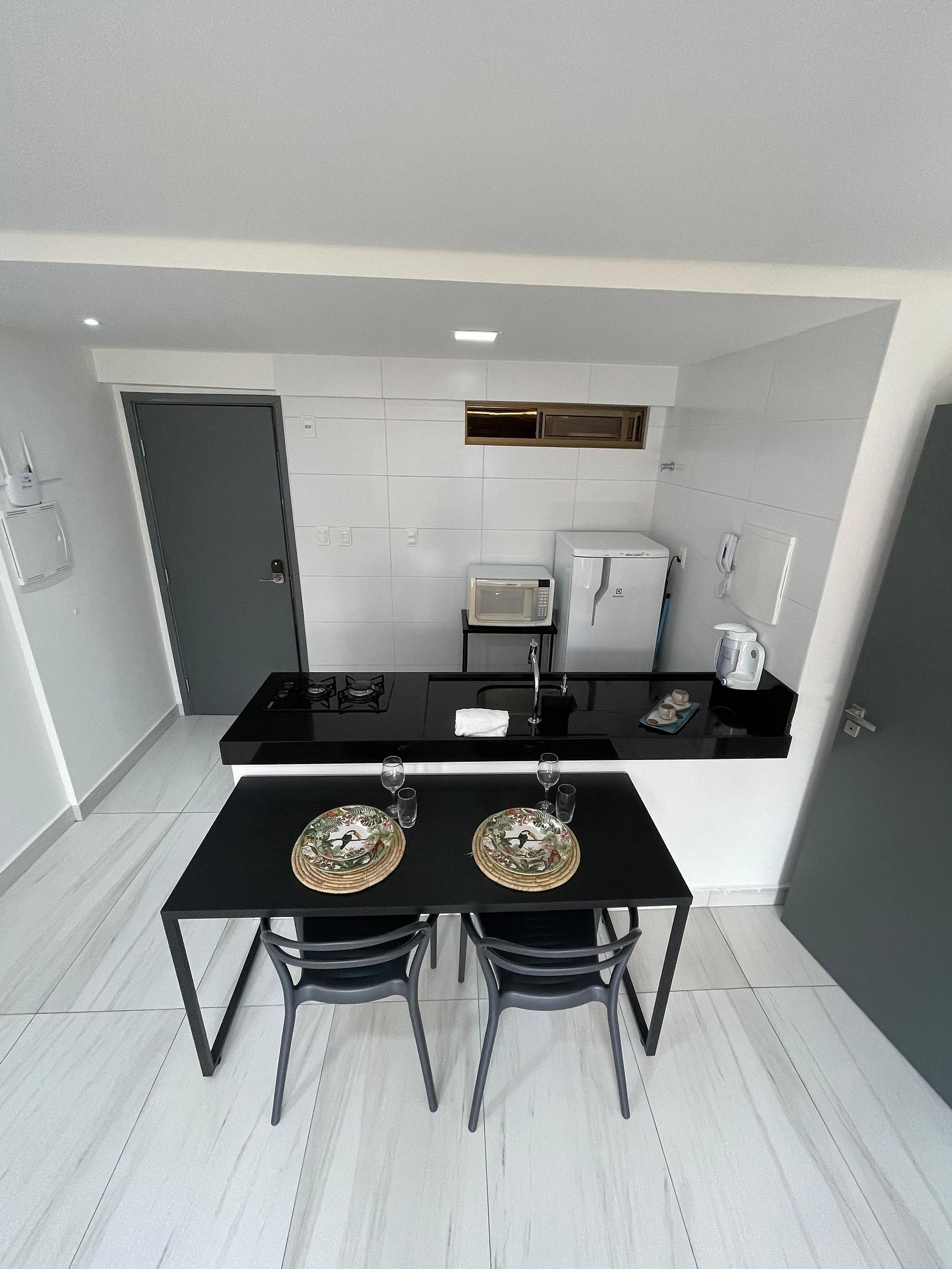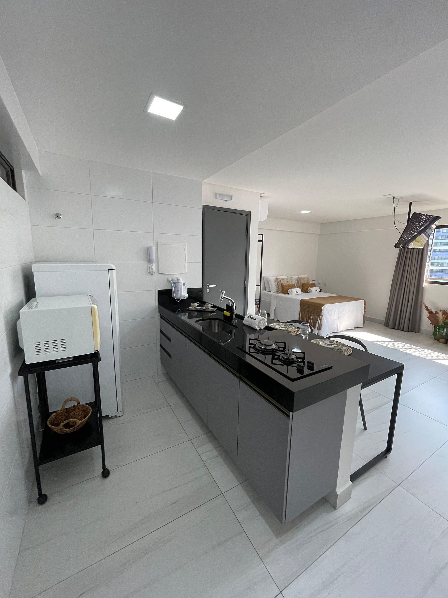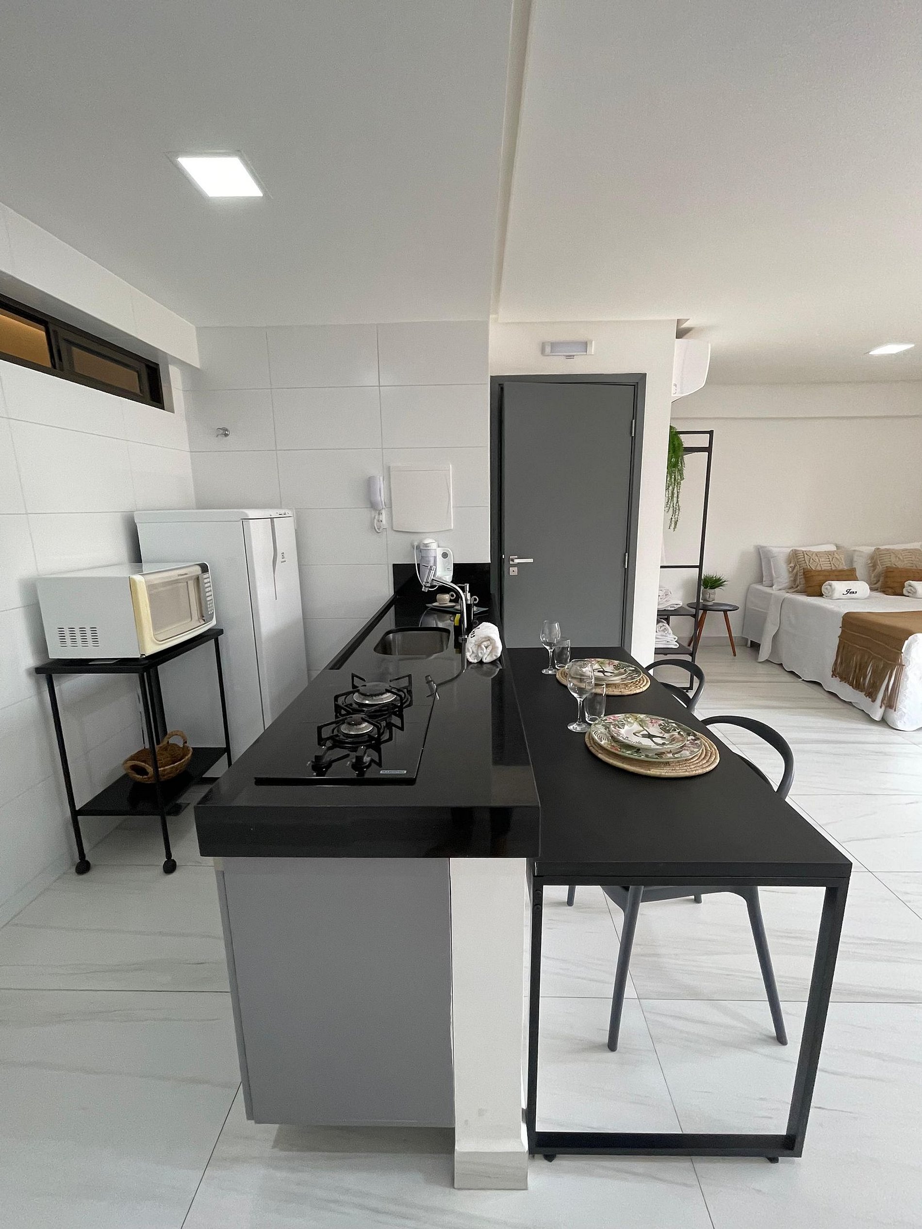 O apartamento é completo, com cozinha equipada (eletrodomésticos e utensílios) para preparar suas refeições com conforto.
