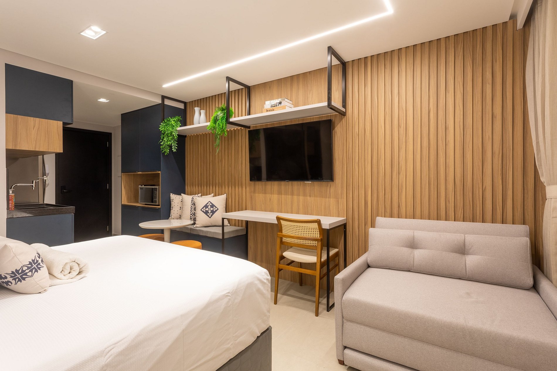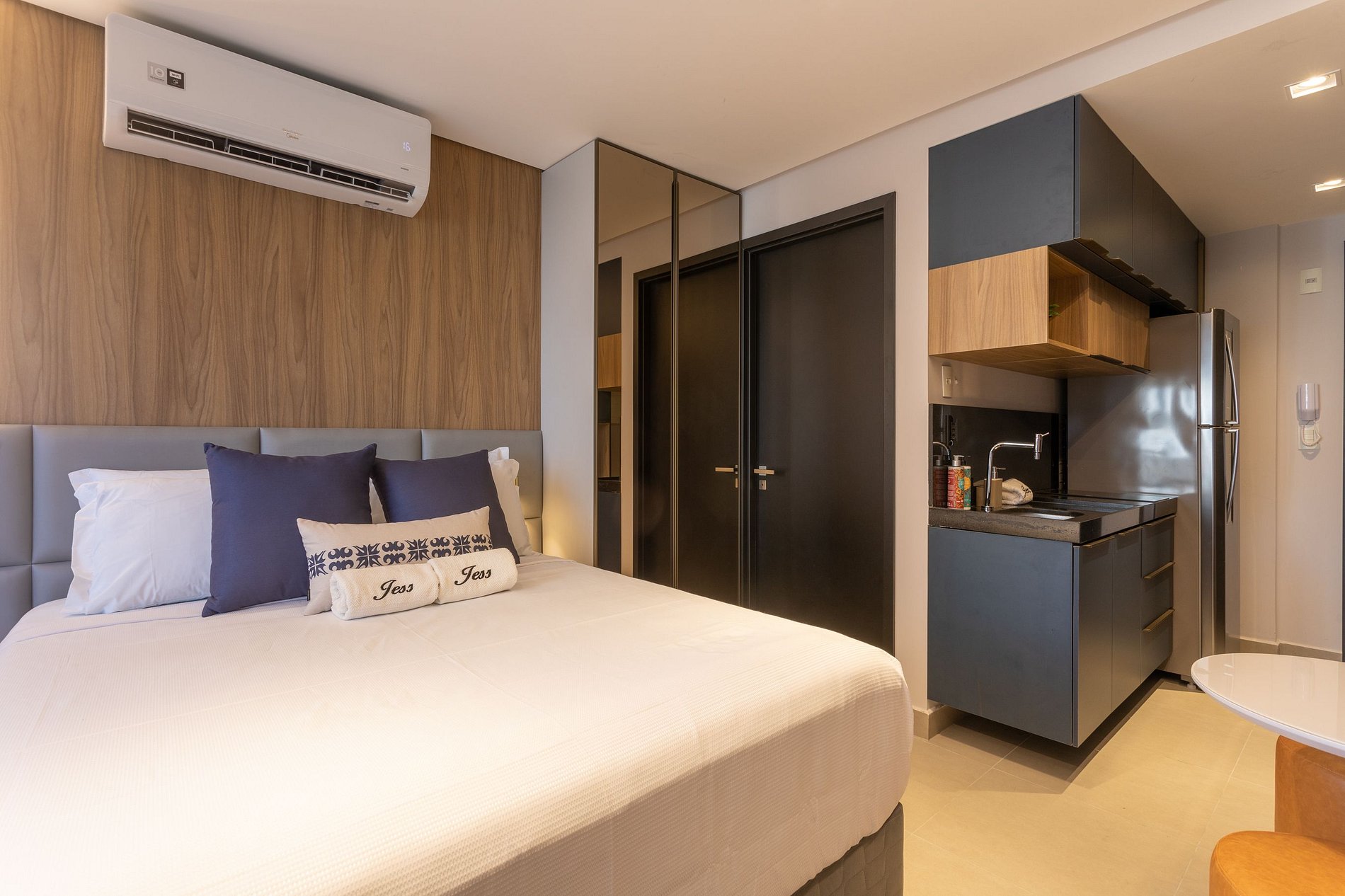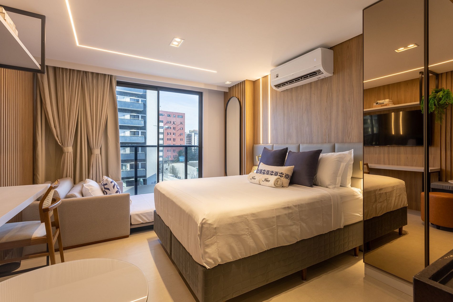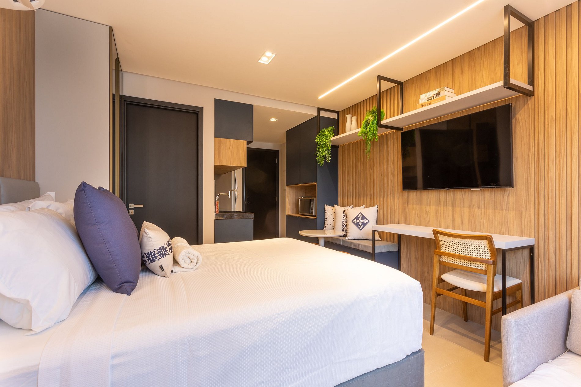 Aproveite a excelente estrutura do condomínio, que inclui piscina, academia, jardim, Wi-Fi gratuito e estacionamento rotativo. As unidades são completamente equipadas com ar-condicionado, cozinha moderna, além de banheiro privativo.