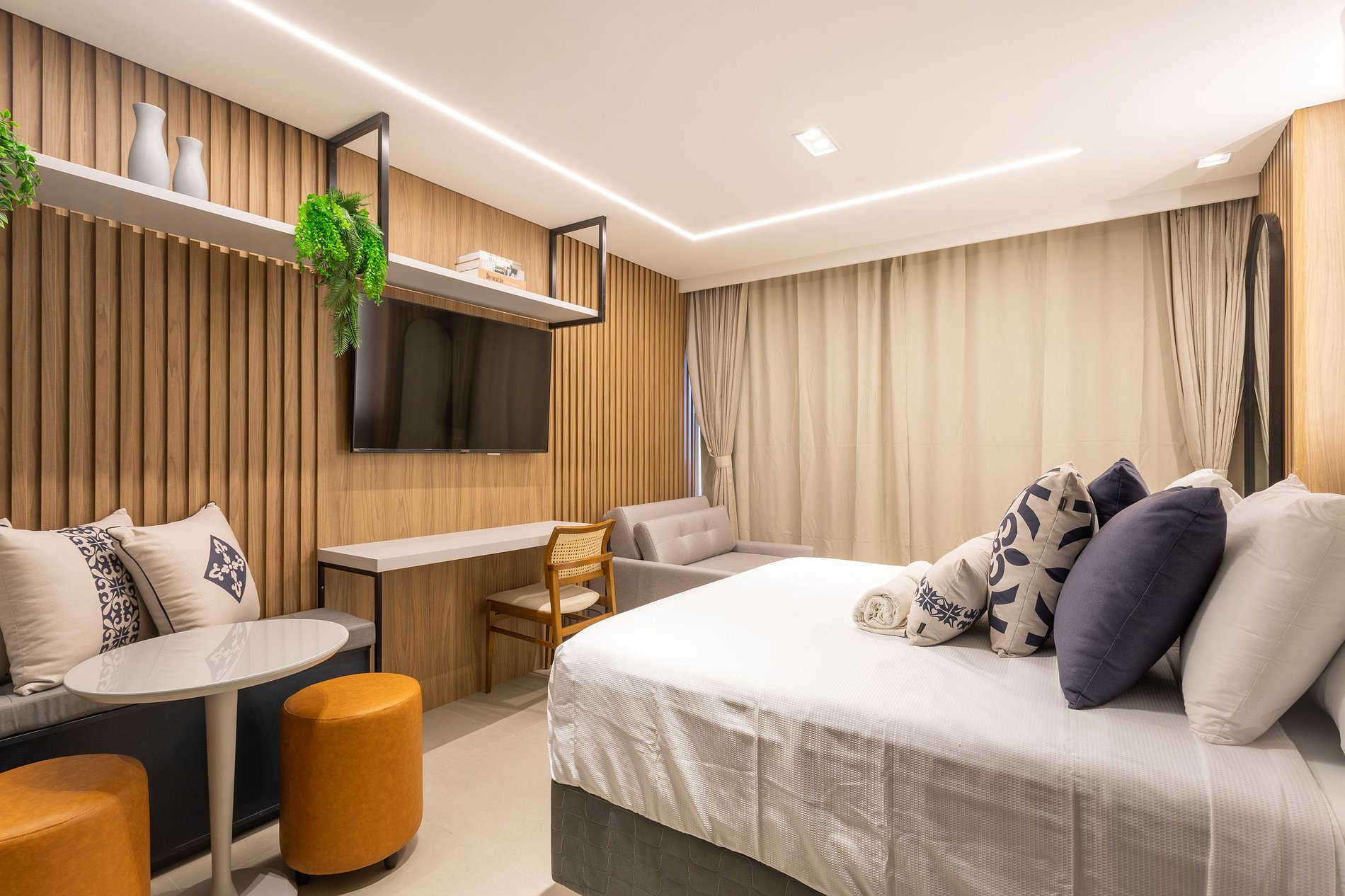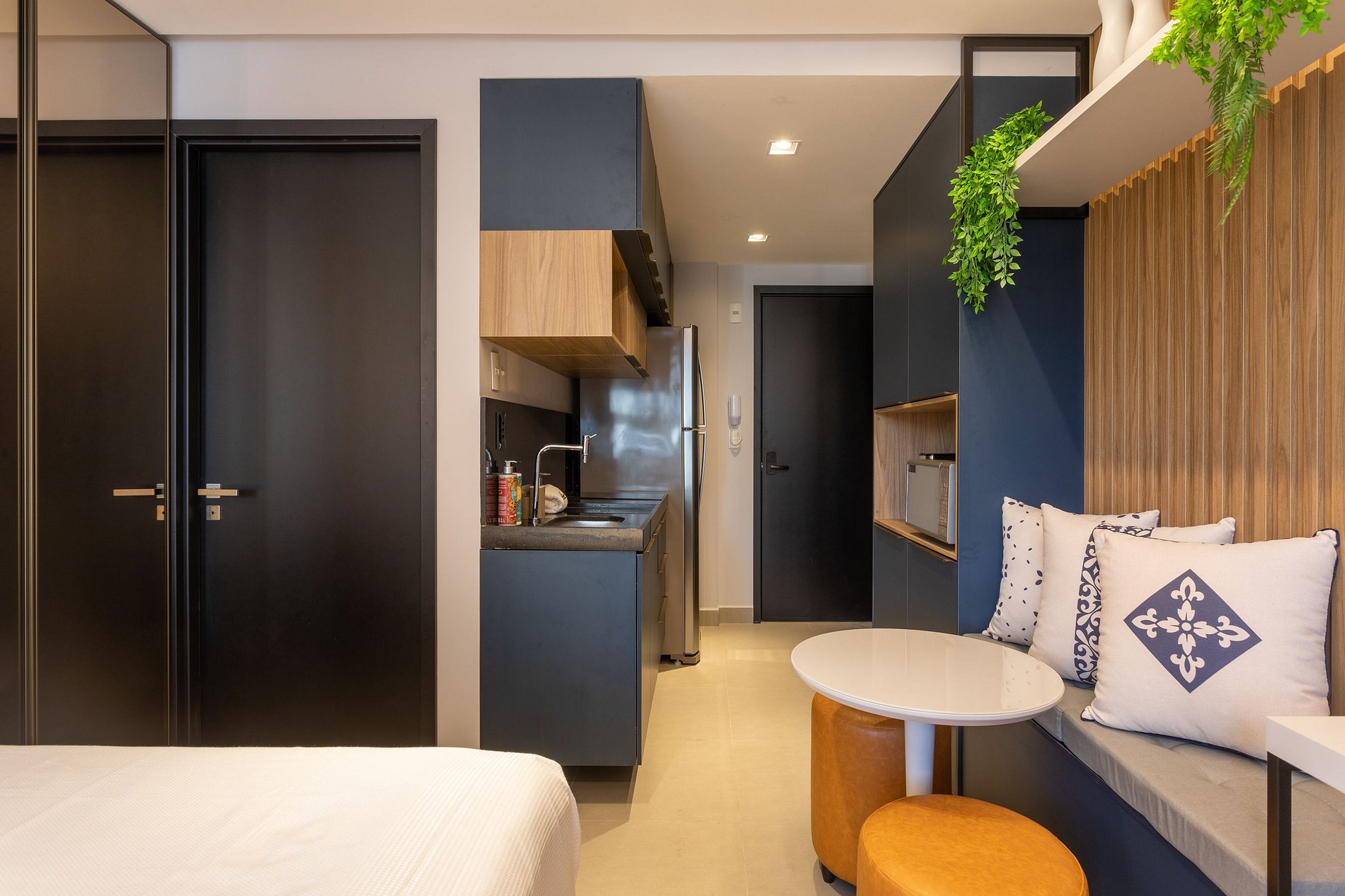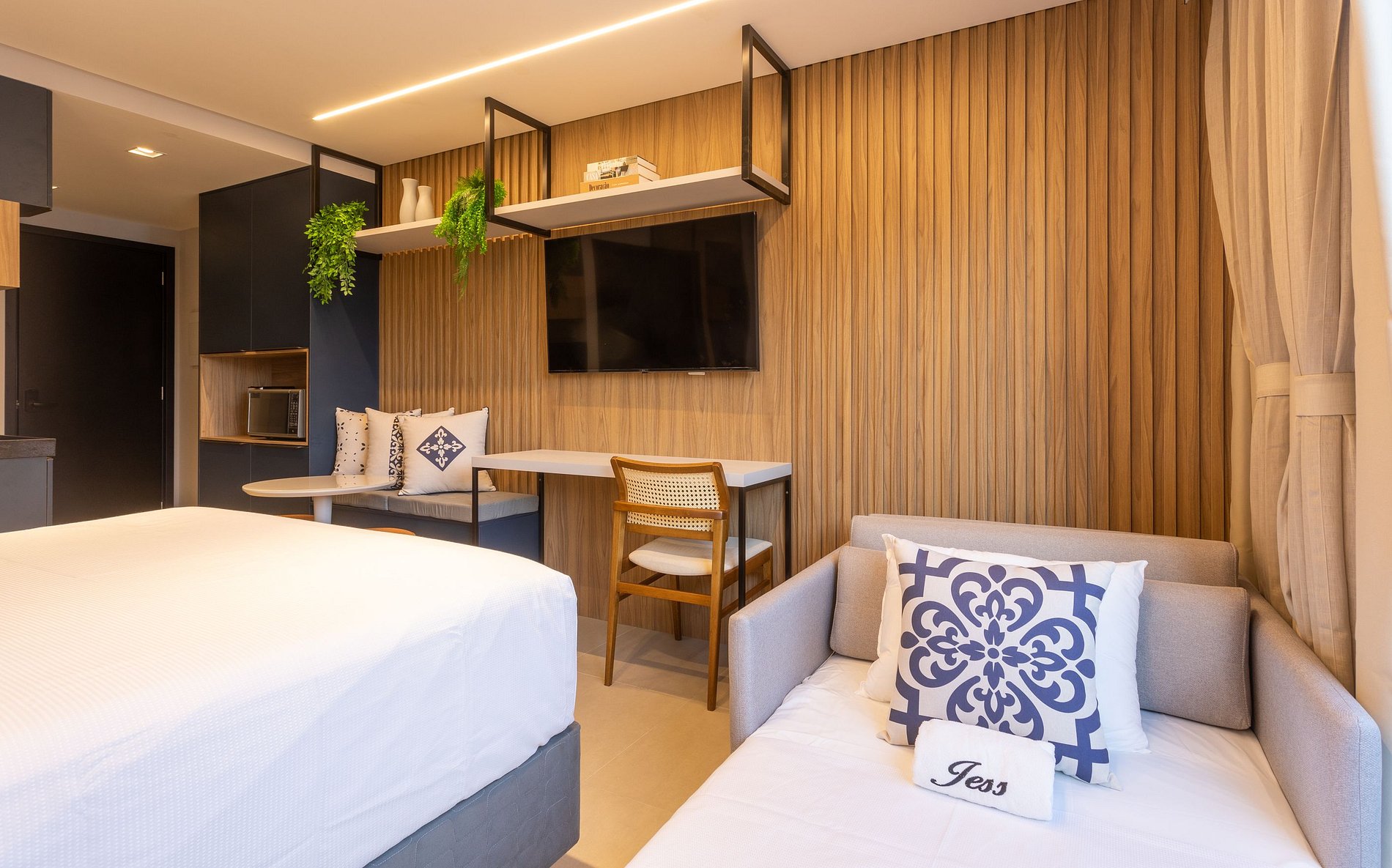 Aproveite a excelente estrutura do condomínio, que inclui piscina, academia, jardim, Wi-Fi gratuito e estacionamento rotativo. As unidades são completamente equipadas com ar-condicionado, cozinha moderna, além de banheiro privativo.