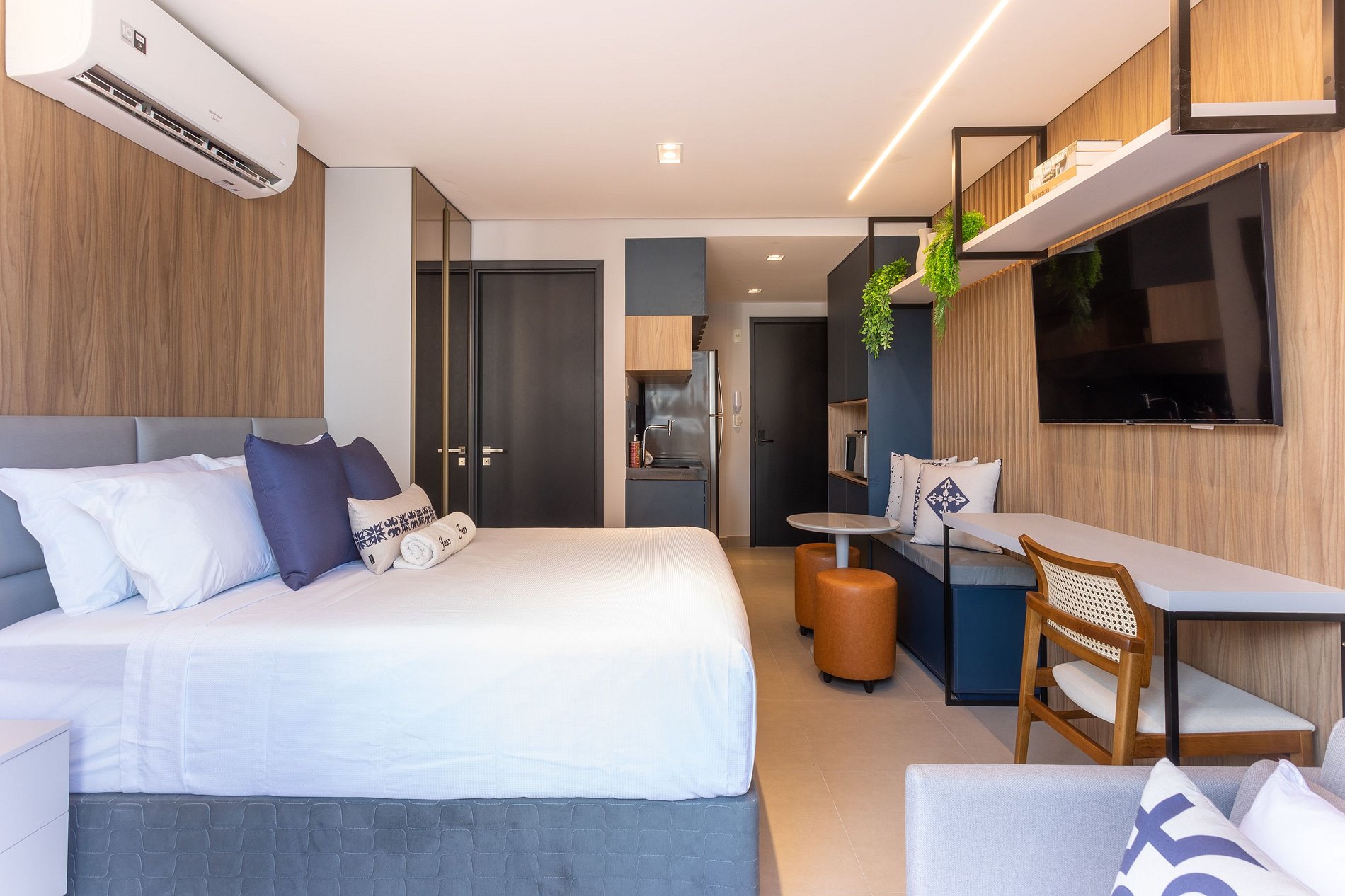 Aproveite a excelente estrutura do condomínio, que inclui piscina, academia, jardim, Wi-Fi gratuito e estacionamento rotativo. As unidades são completamente equipadas com ar-condicionado, cozinha moderna, além de banheiro privativo.