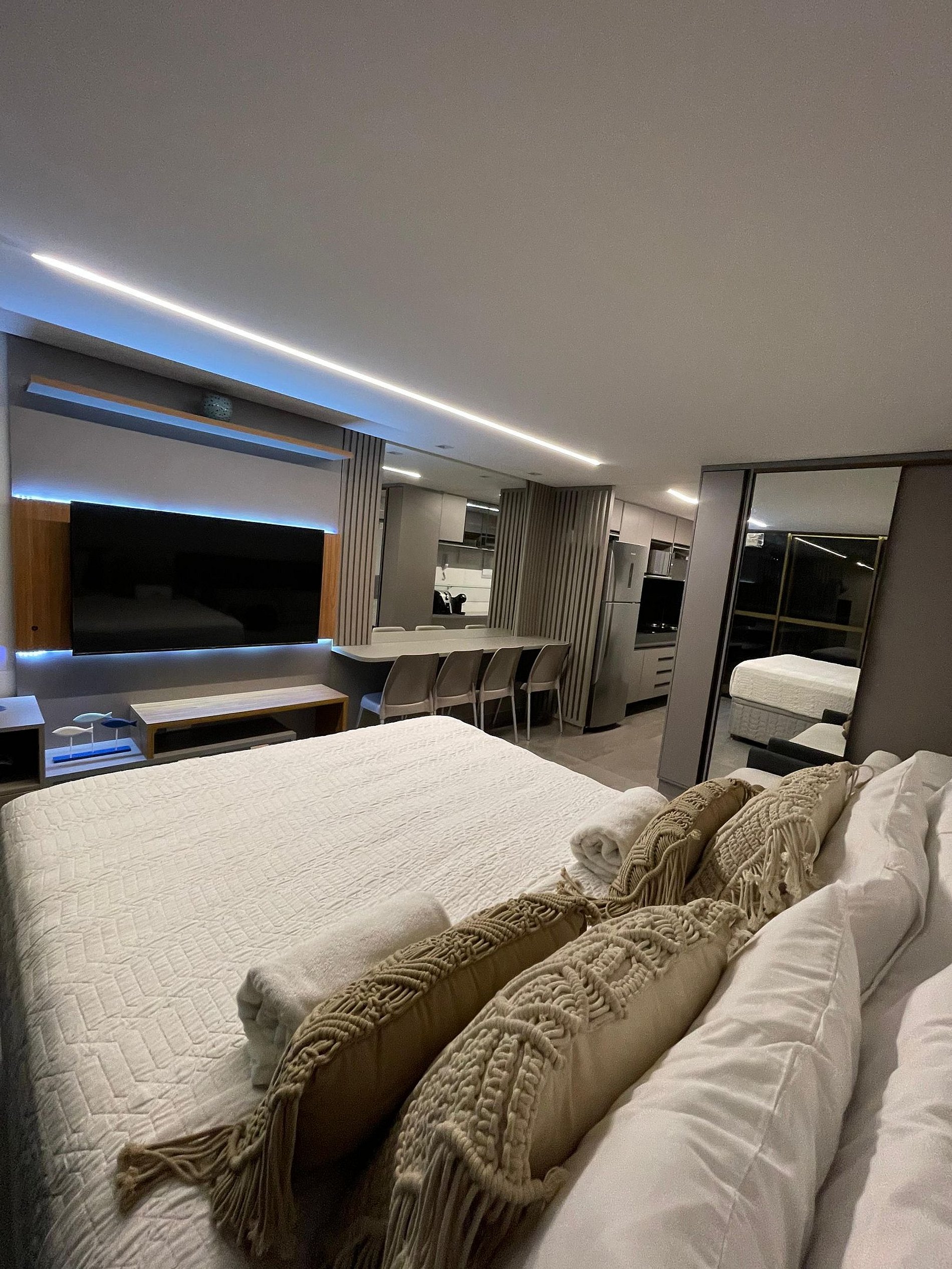 - O flat é super funcional com uma cama queen e sofá cama, guarda-roupa, mesa de apoio.