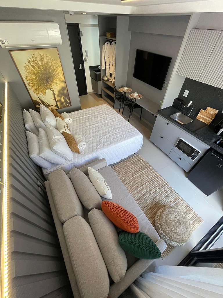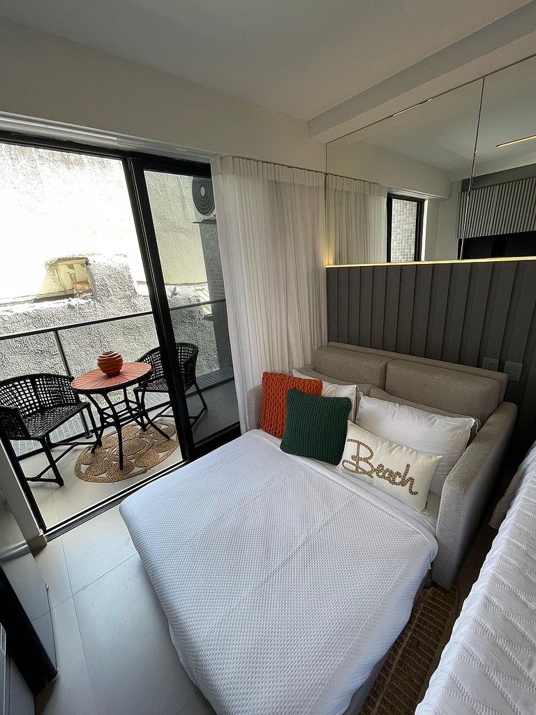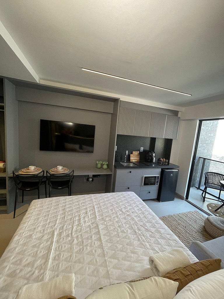 O apartamento é completo, com cama super confortável e sofá-cama e uma pequesna varanda. Cozinha completa com geladeira, cooktop, microondas, e todos os utensílios básicos, para preparar suas refeições.