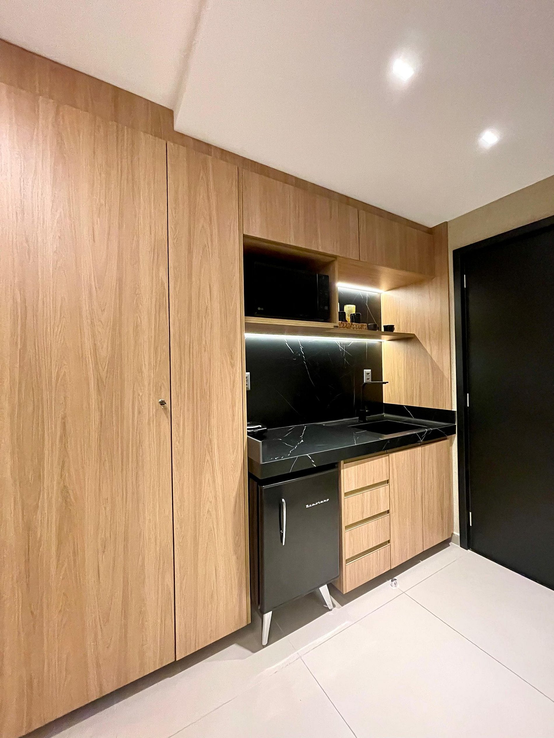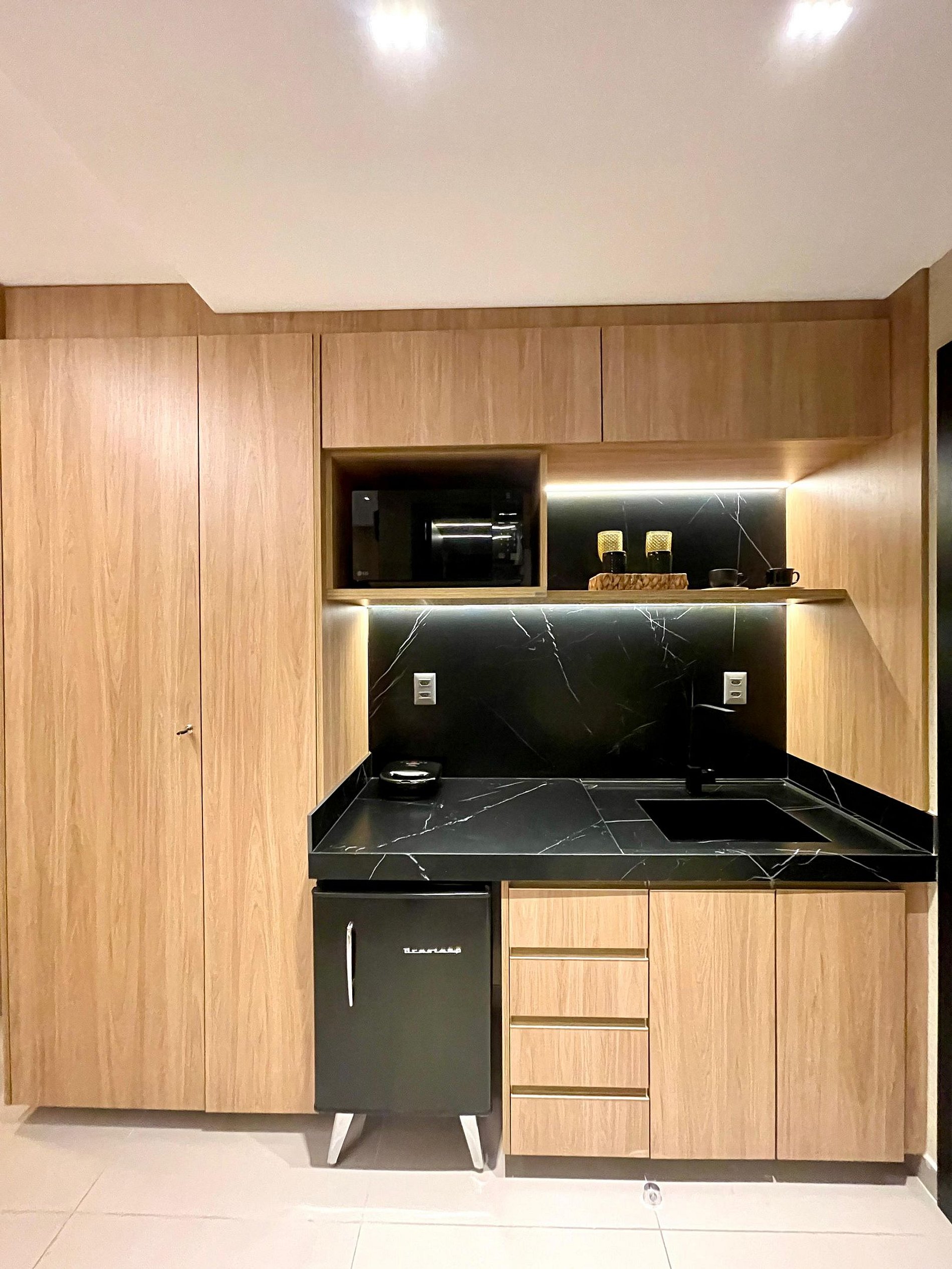 O apartamento é completo, com cama super confortável e uma pequena varanda. Cozinha compacta e funcional.