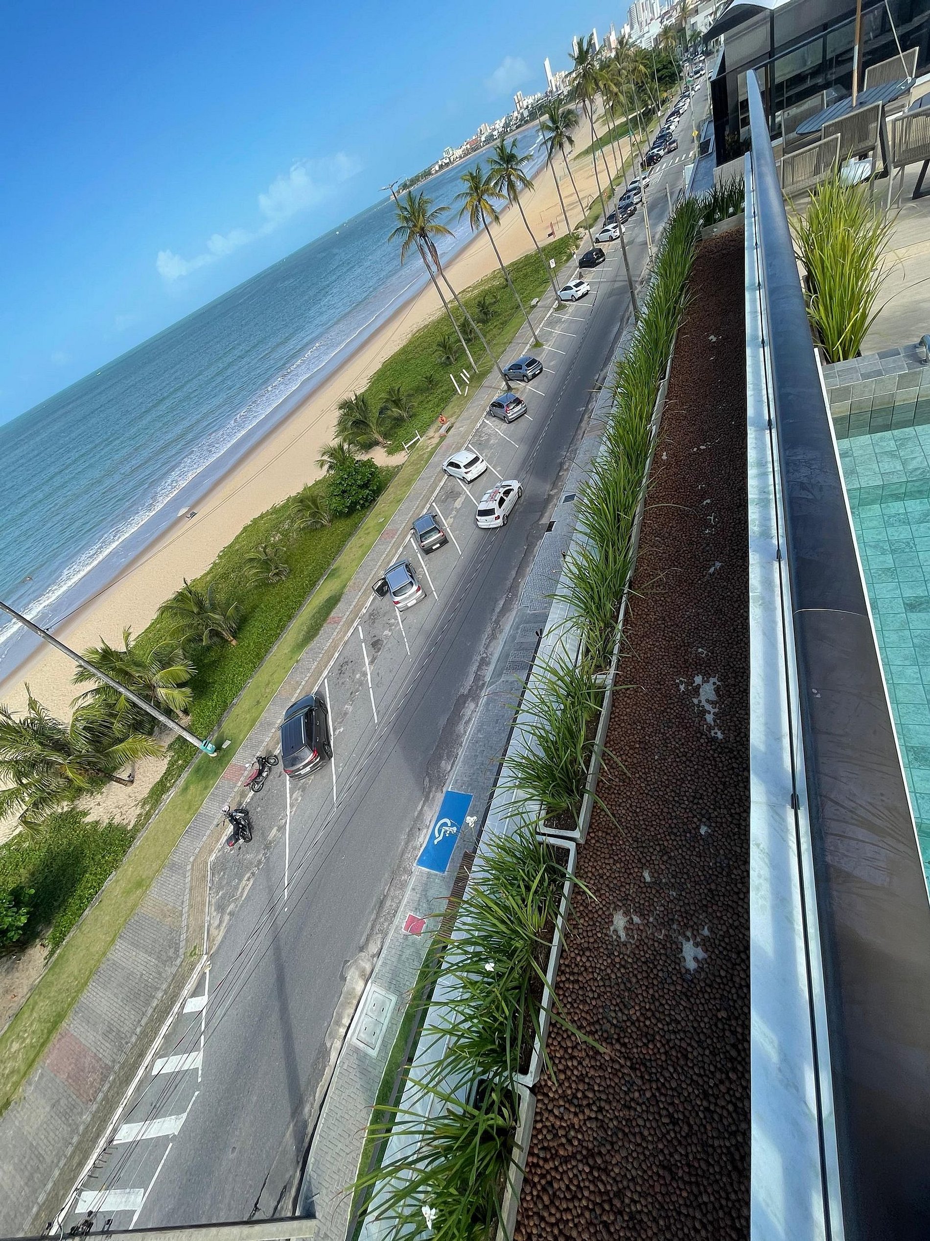 A cobertura, tem uma linda vista do mar e da praia, com a área de lazer confortável e espaçosa, com espreguiçadeiras confortáveis, oferecendo o melhor conforto para você e sua família.