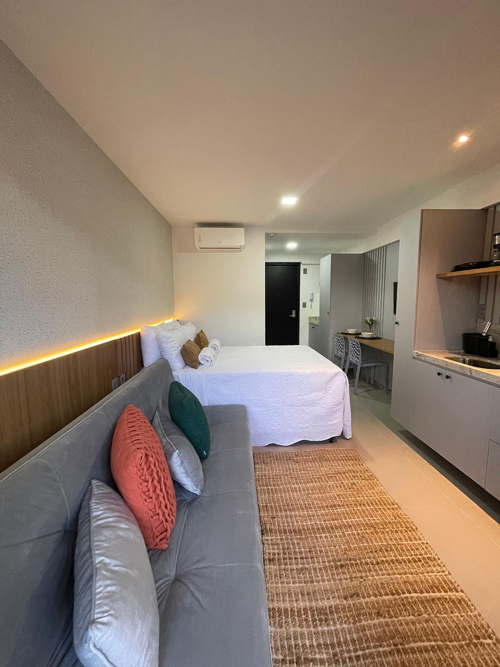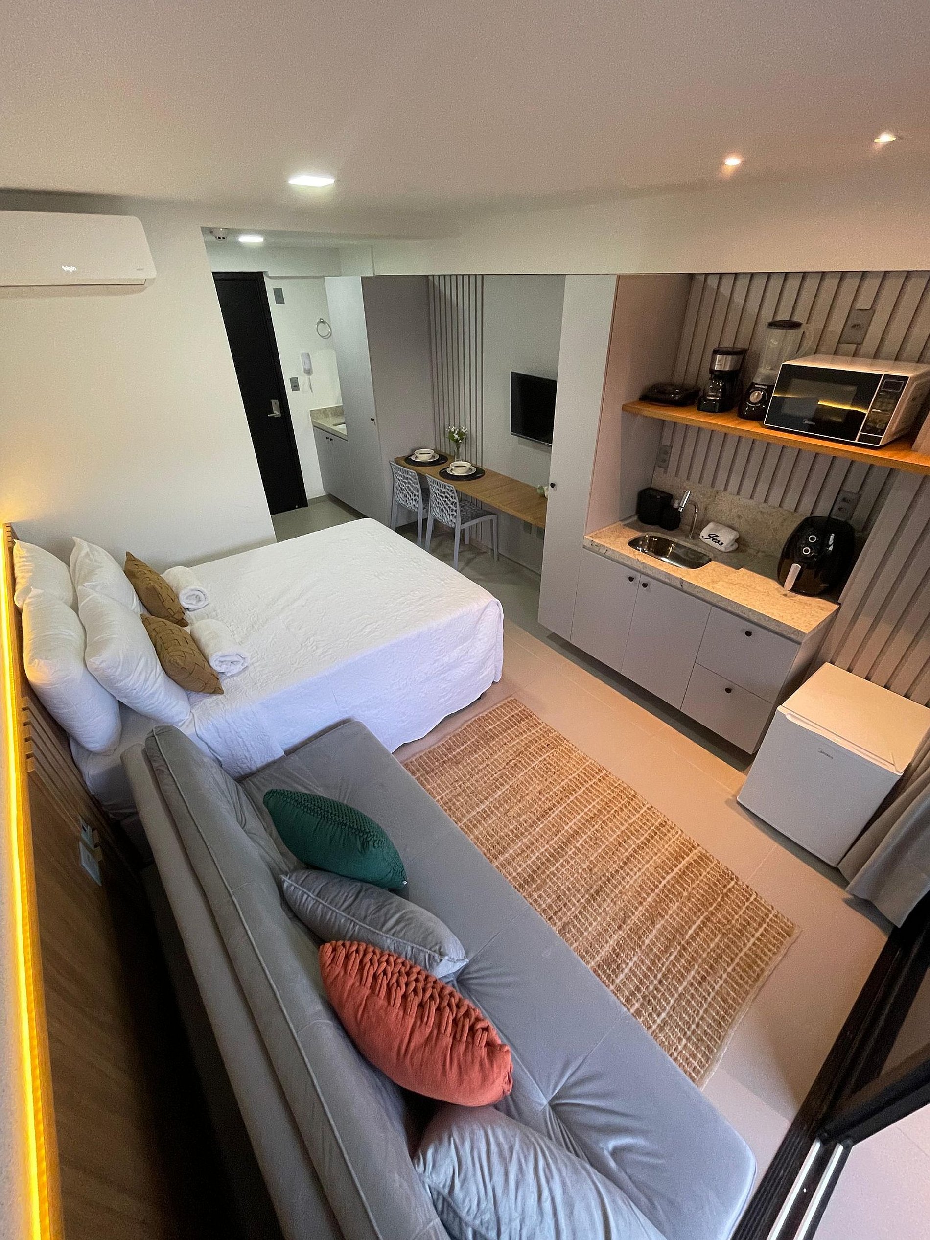 O apartamento é completo, com cama super confortável e sofá-cama e uma pequesna varanda. Cozinha completa com geladeira, microondas, e todos os utensílios básicos, para preparar suas refeições.