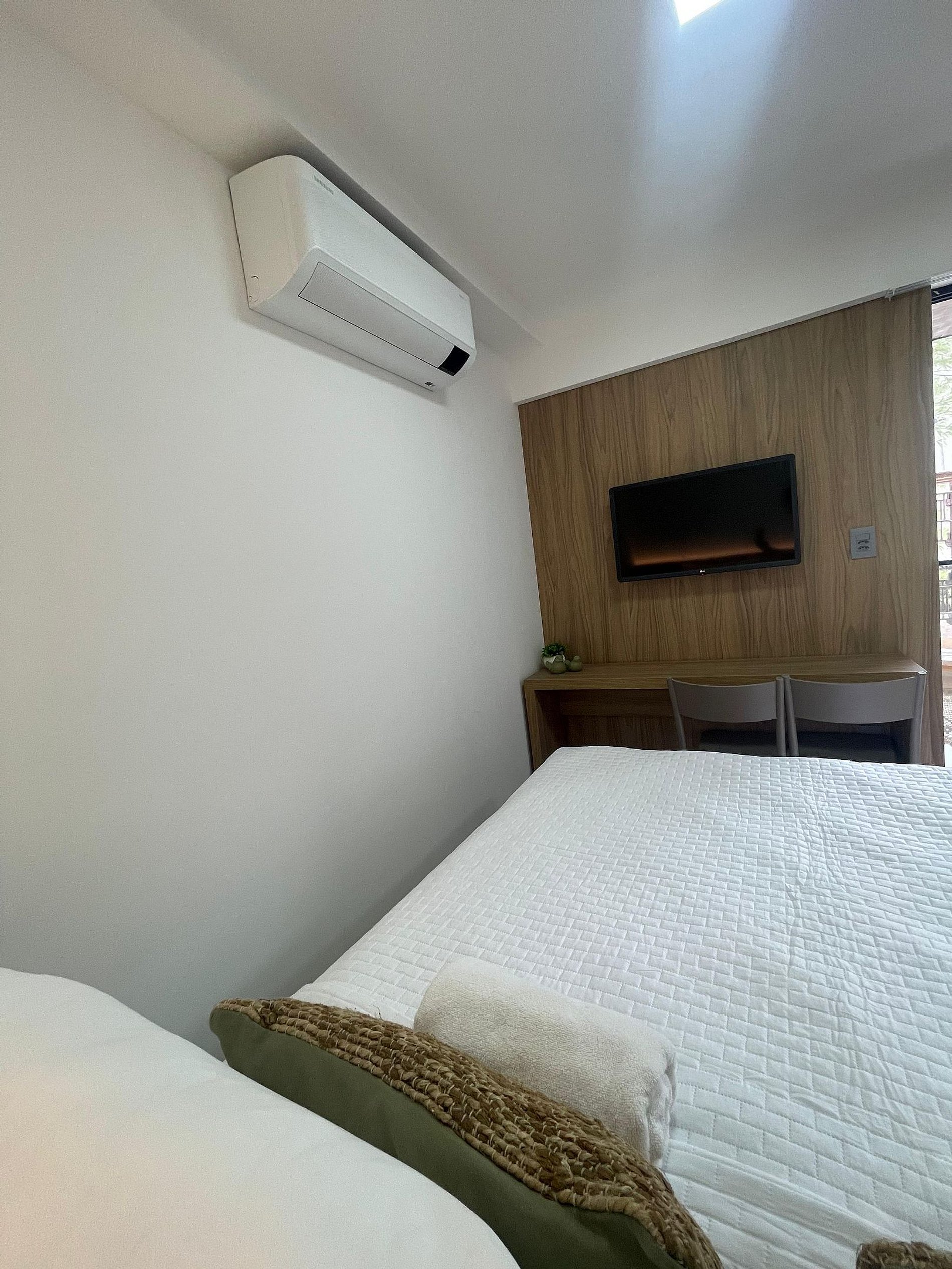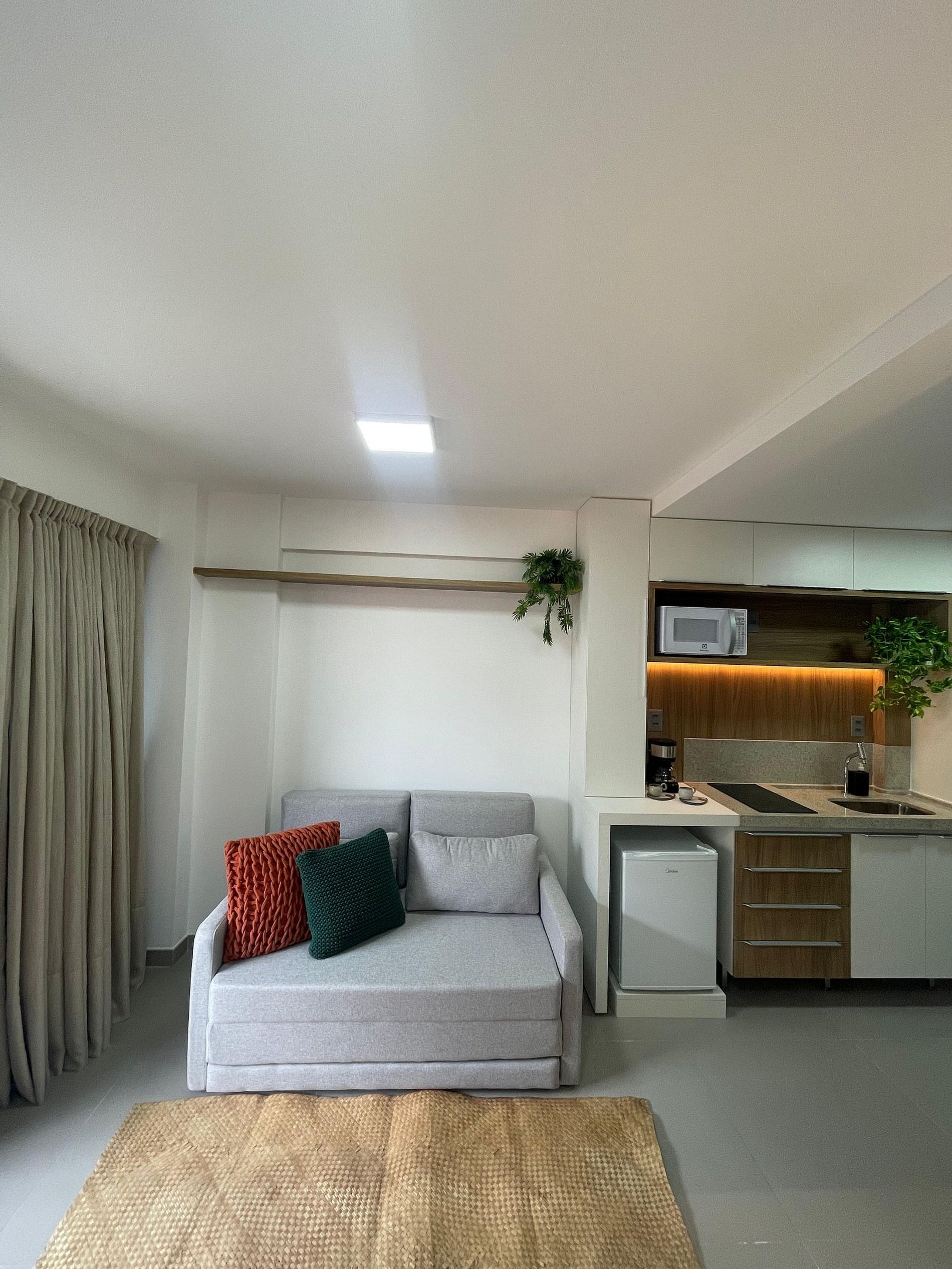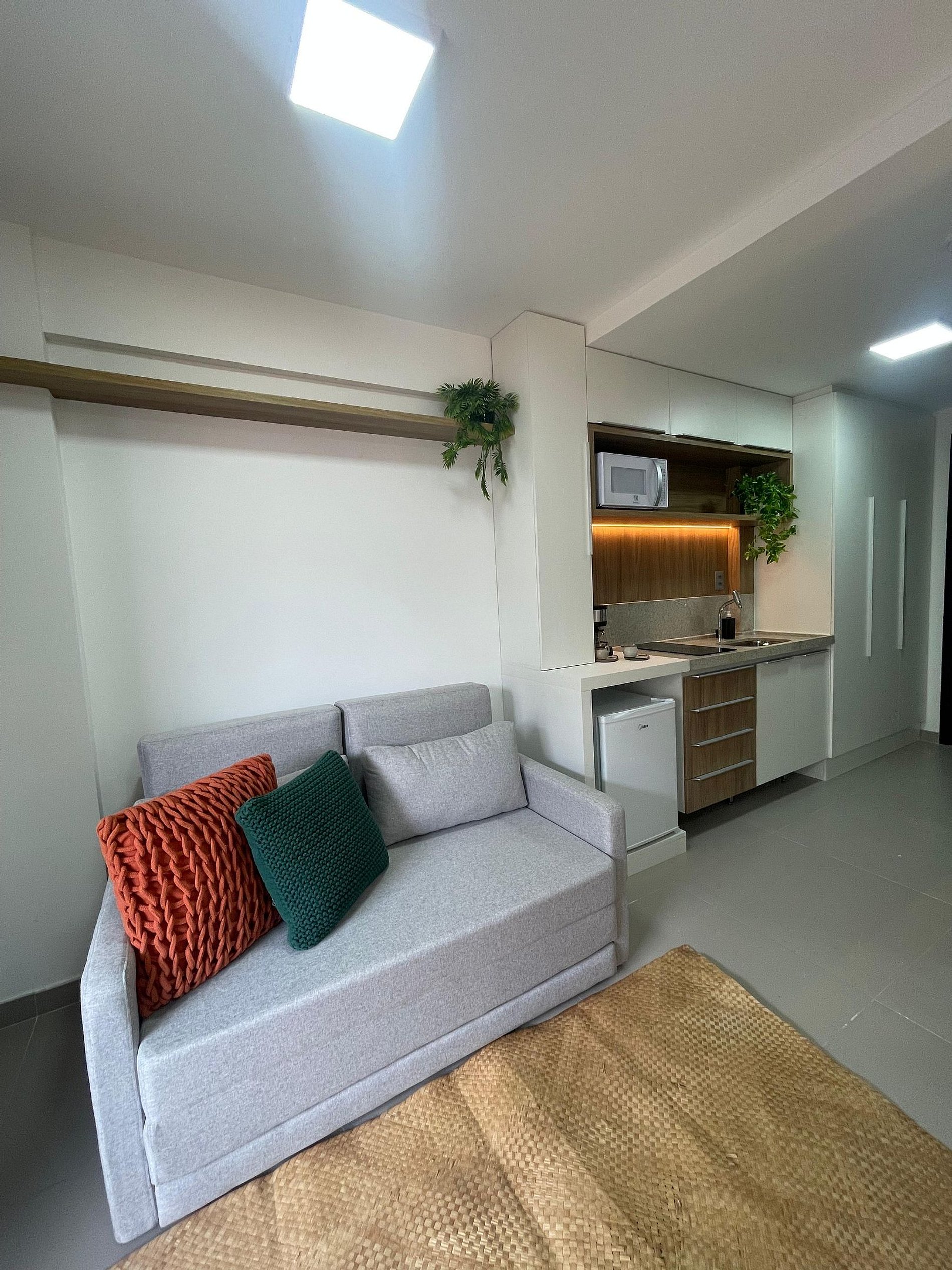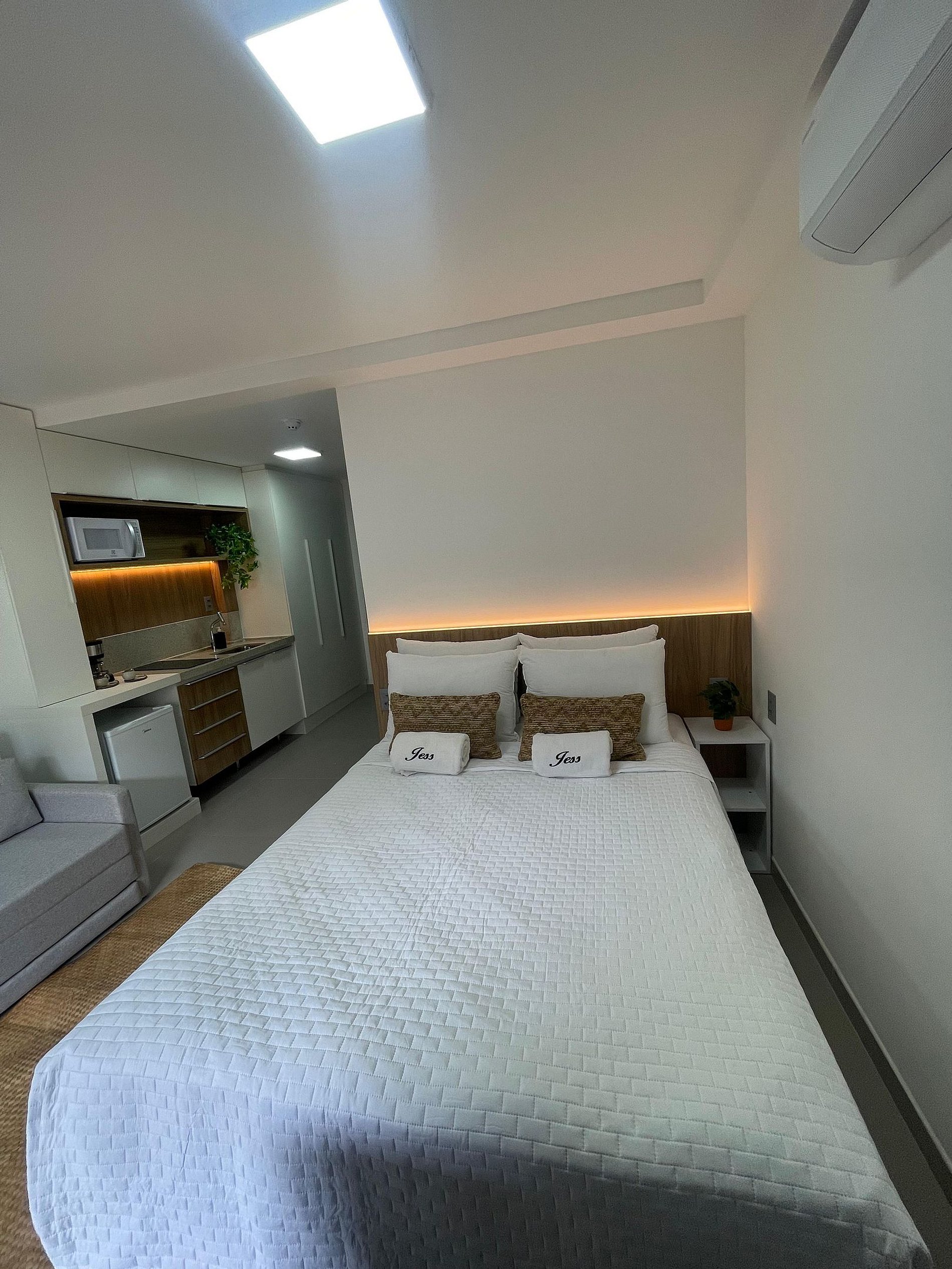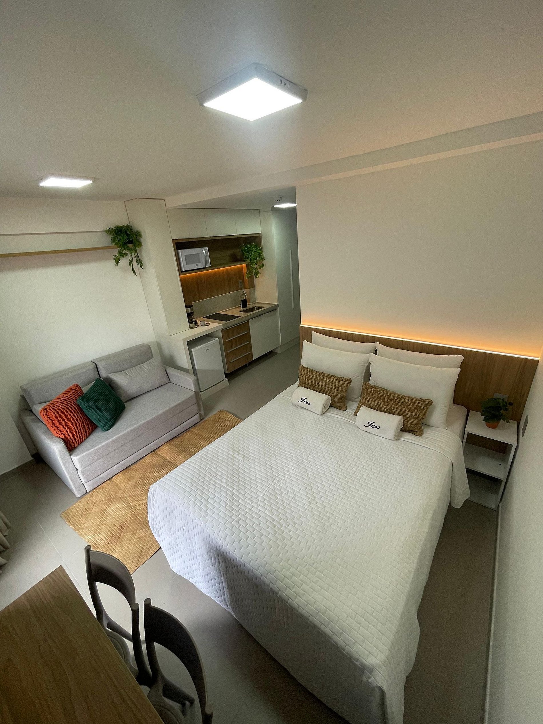 O apartamento é completo, com cama super confortável e uma pequena varanda. Cozinha compacta e funcional.