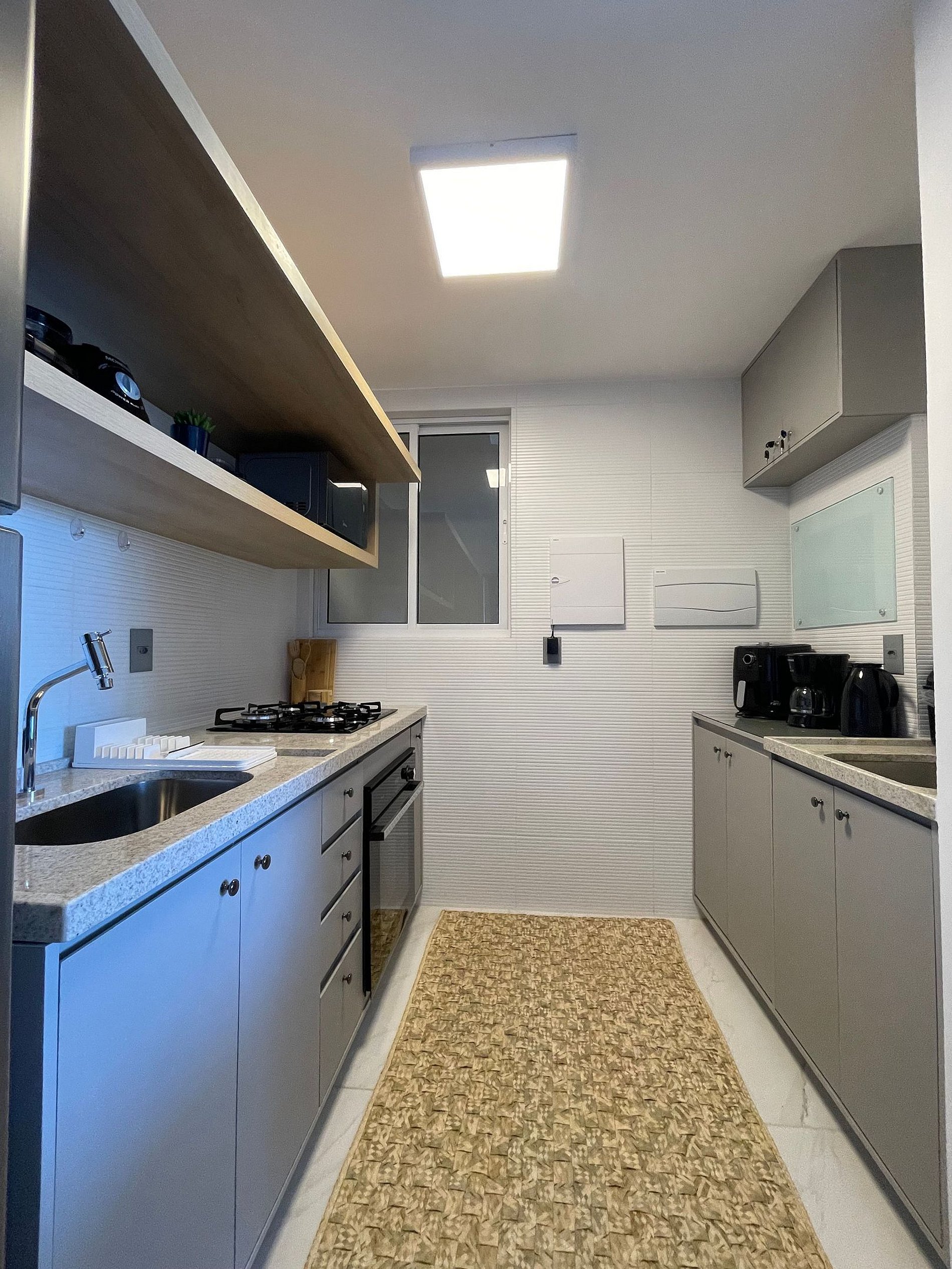 A cozinha é funcional, equipada com geladeira, micro-ondas, cooktop e armários planejados. Há também uma bancada com banquetas para refeições rápidas. O banheiro é bem acabado, com box de vidro e espelho amplo. Cada ambiente foi cuidadosamente decorado para criar um clima aconchegante, com toque contemporâneo e ótima iluminação natural.