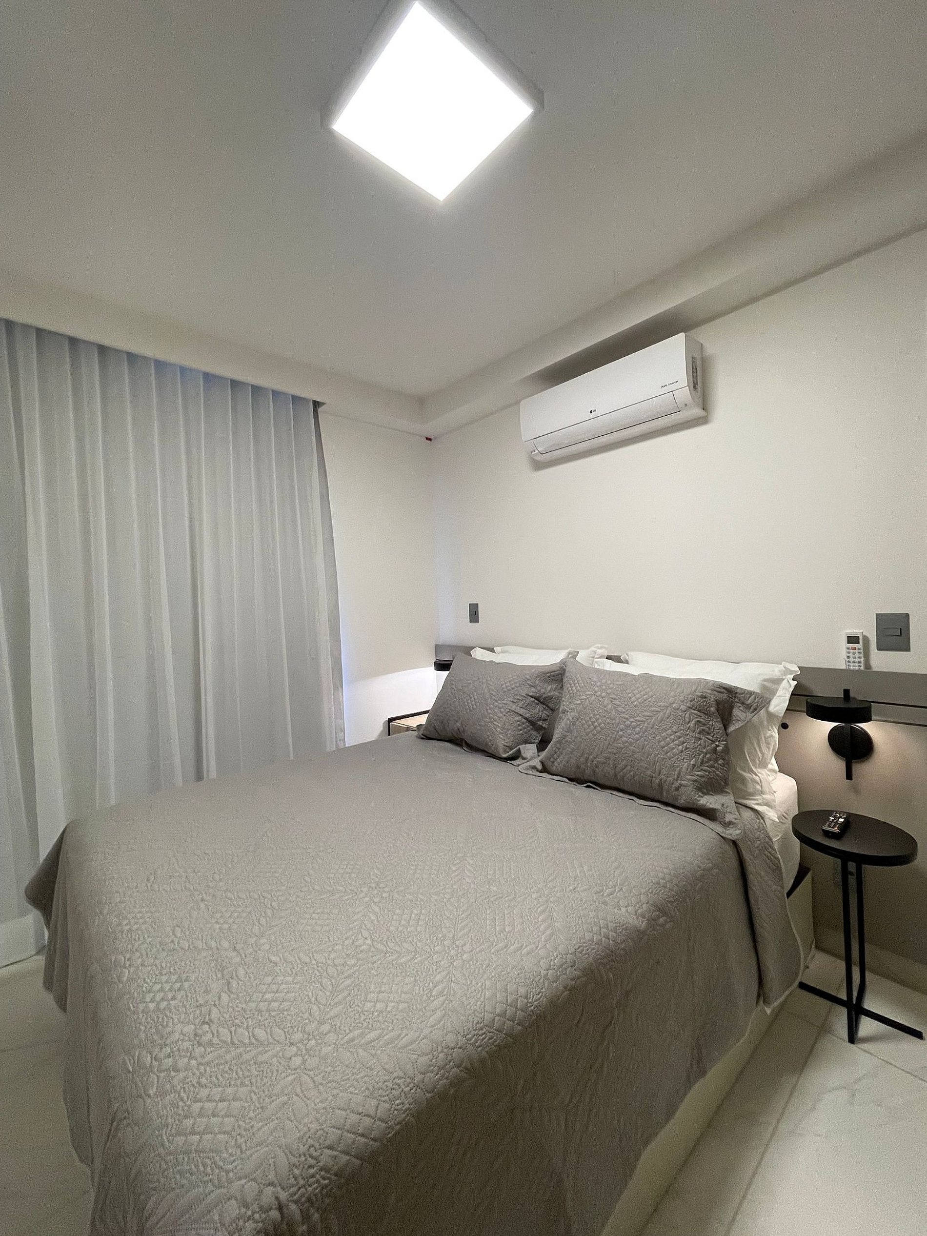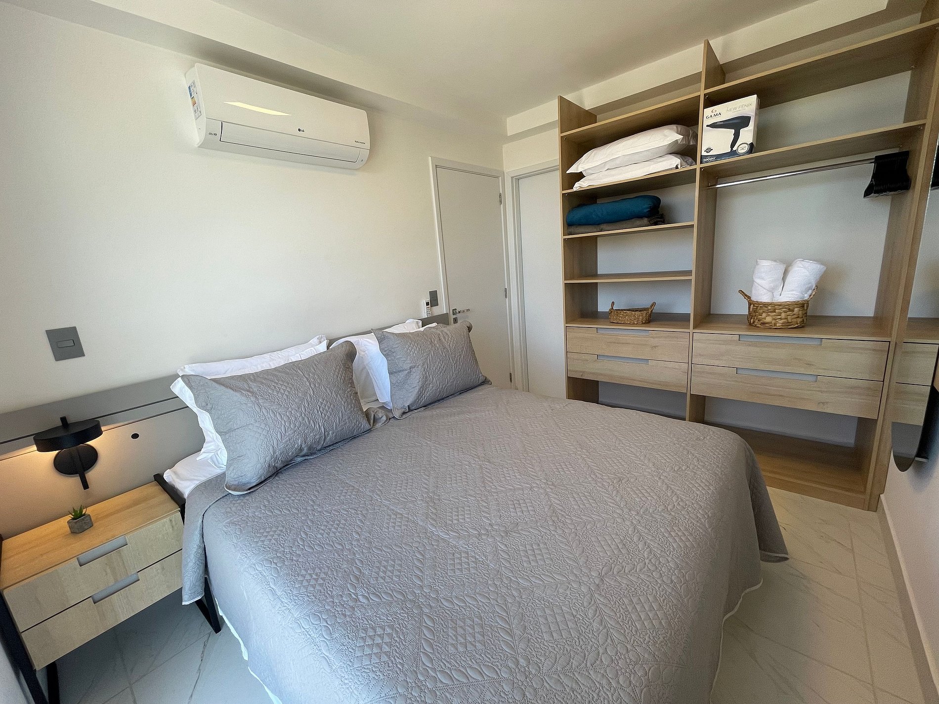 O quarto possui uma cama queen com enxoval leve e elegante, além de um espelho grande que amplia o ambiente. A decoração é suave, com tons claros, quadros modernos e detalhes em madeira clara que trazem sofisticação ao espaço.