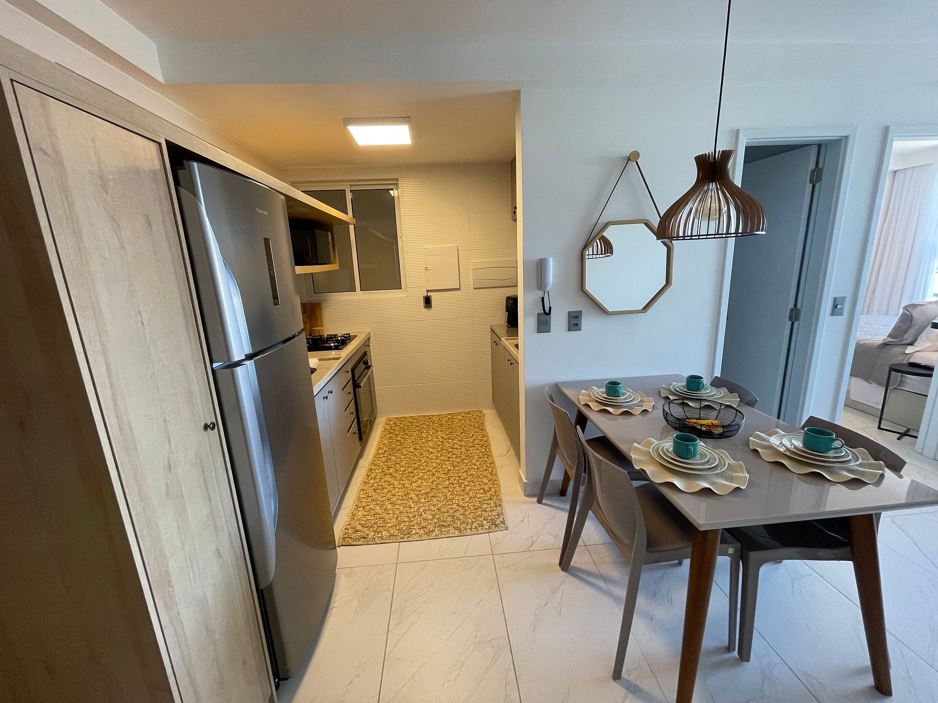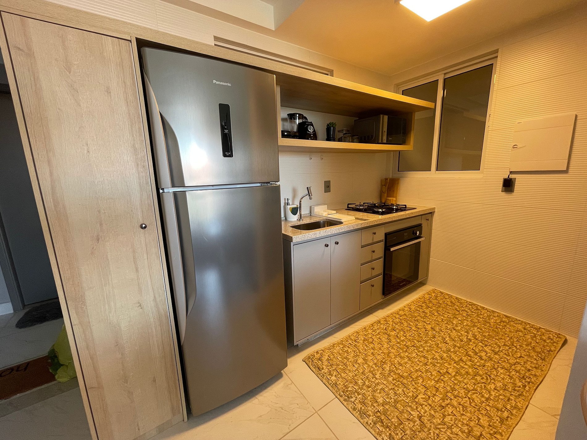 A cozinha é funcional, equipada com geladeira, micro-ondas, cooktop e armários planejados. Há também uma bancada com banquetas para refeições rápidas. O banheiro é bem acabado, com box de vidro e espelho amplo. Cada ambiente foi cuidadosamente decorado para criar um clima aconchegante, com toque contemporâneo e ótima iluminação natural.