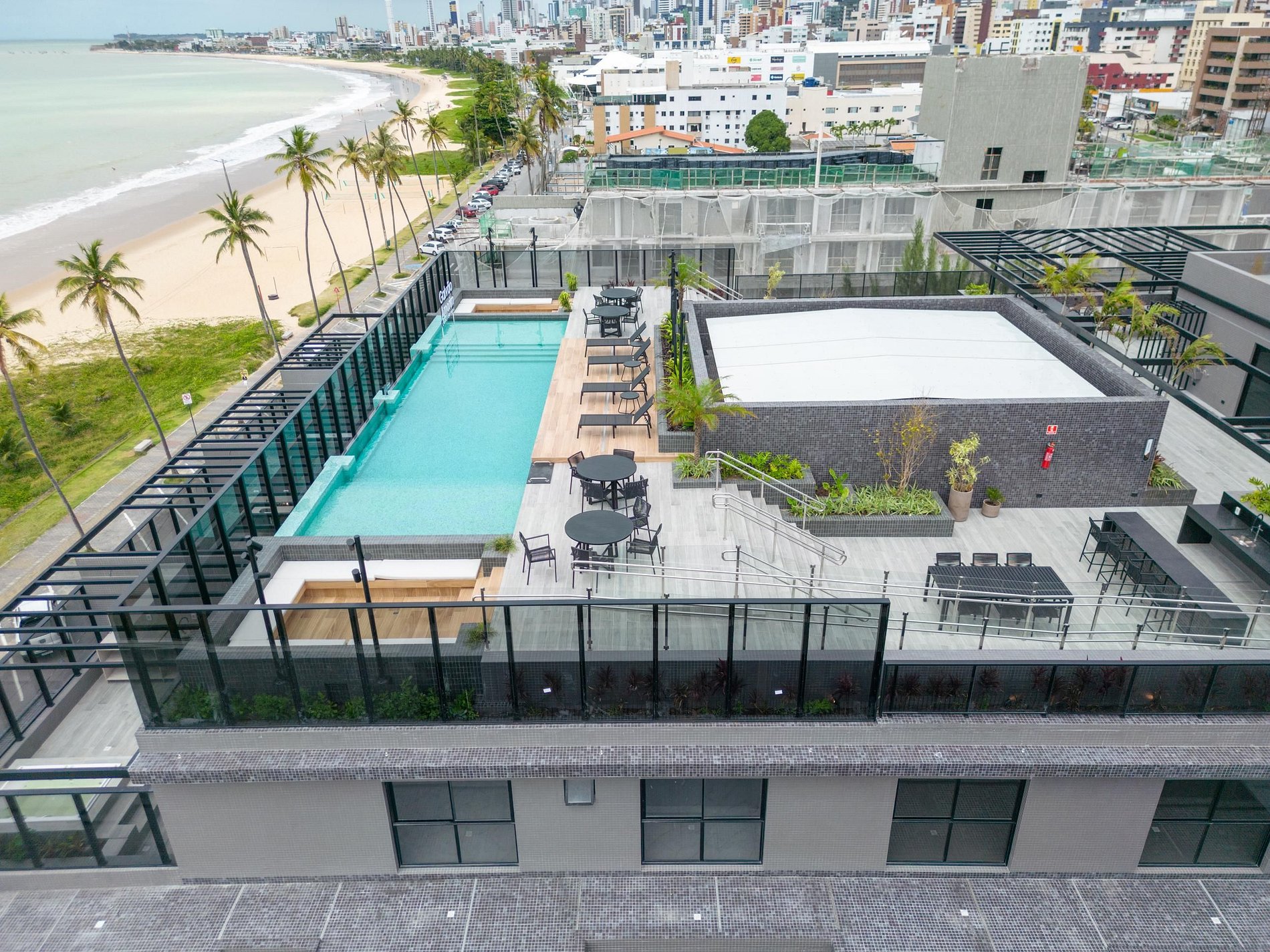 A cobertura, tem uma linda vista do mar e da praia, com a área de lazer confortável e espaçosa, com espreguiçadeiras confortáveis, oferecendo o melhor conforto para você e sua família.