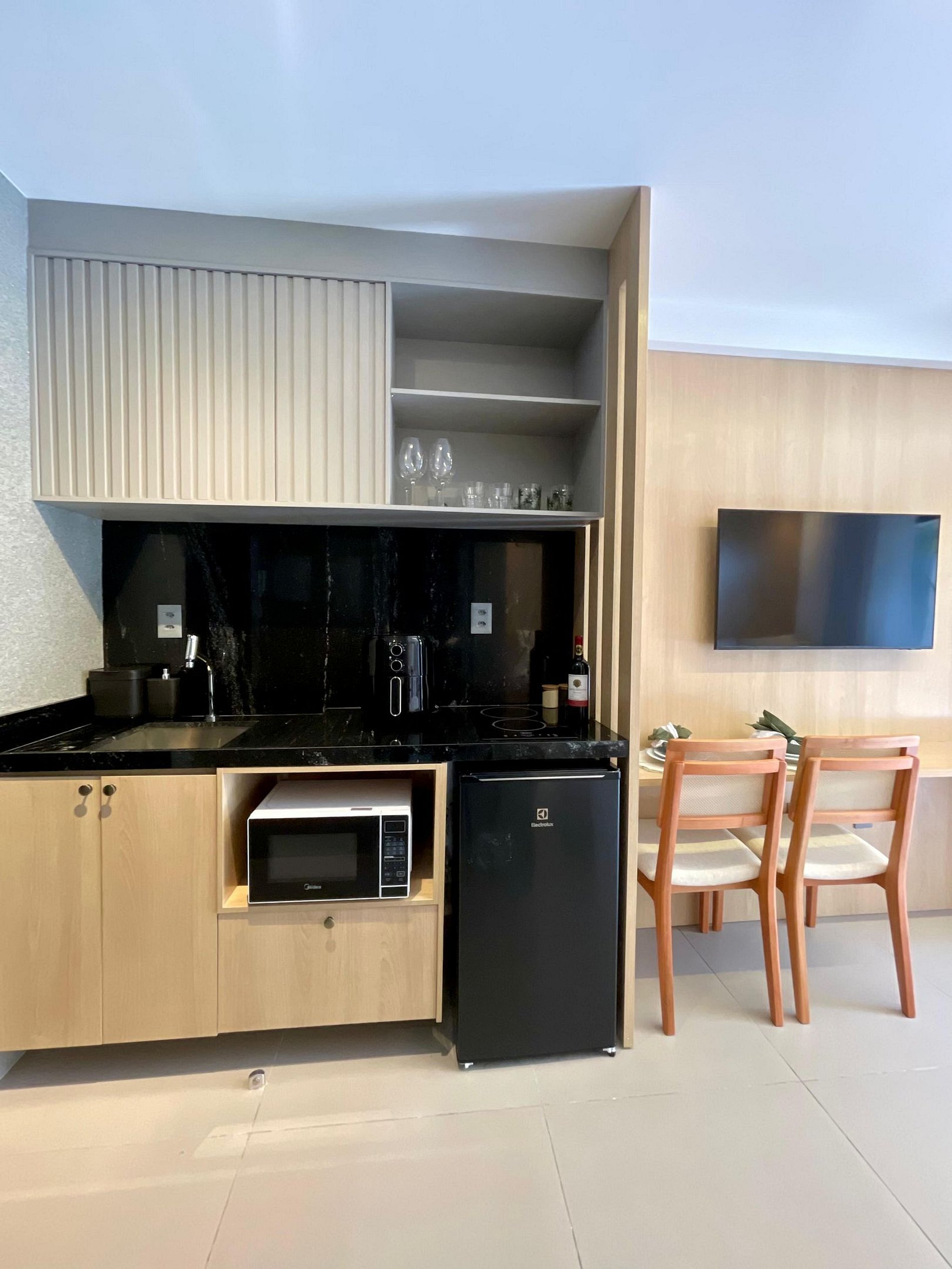 O apartamento é completo, com cozinha equipada (eletrodomésticos e utensílios) para preparar suas refeições com conforto.