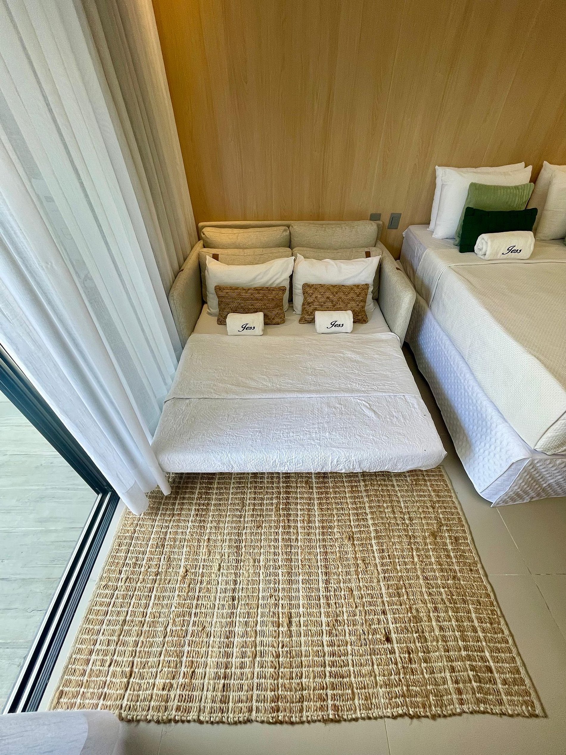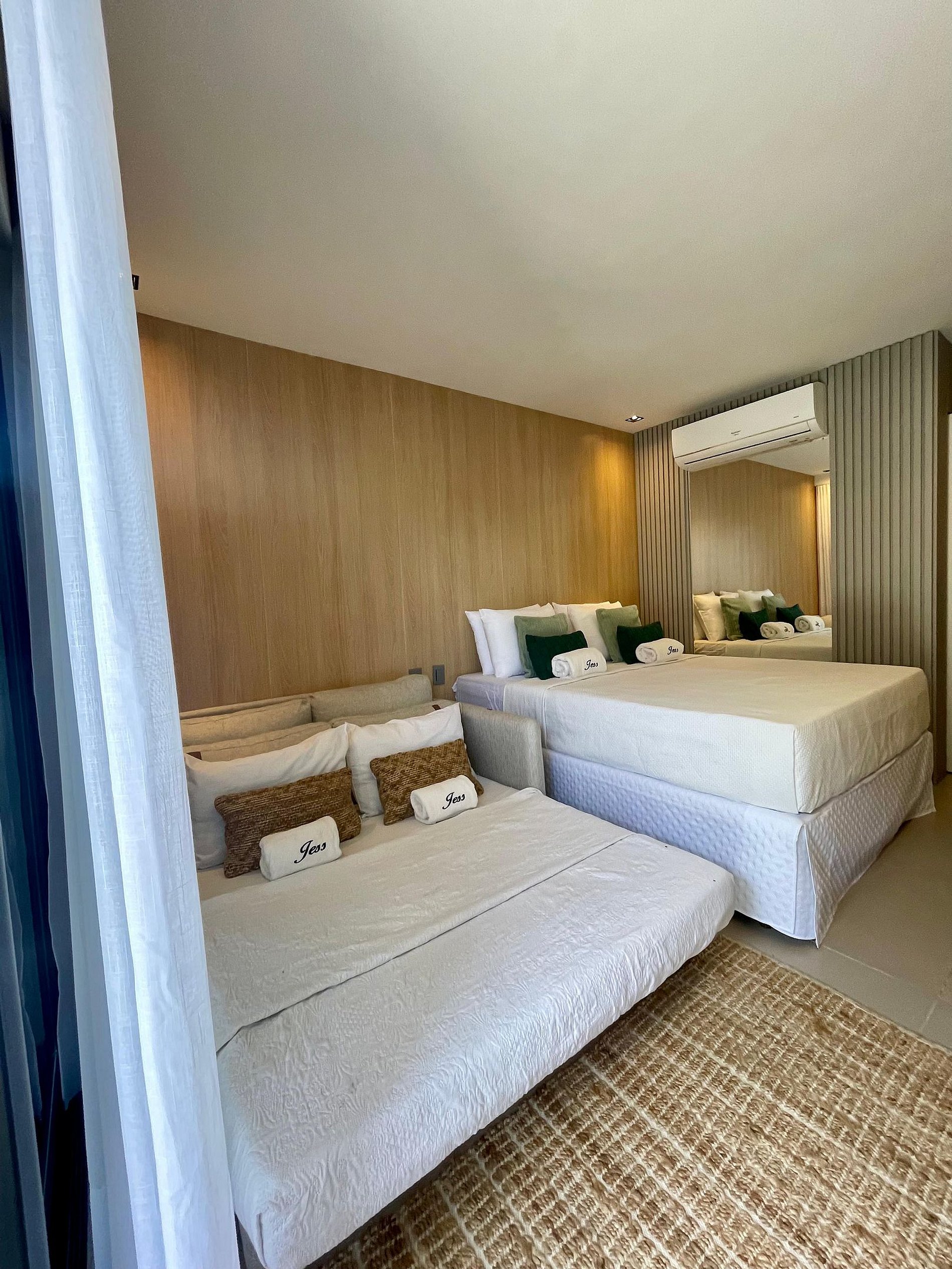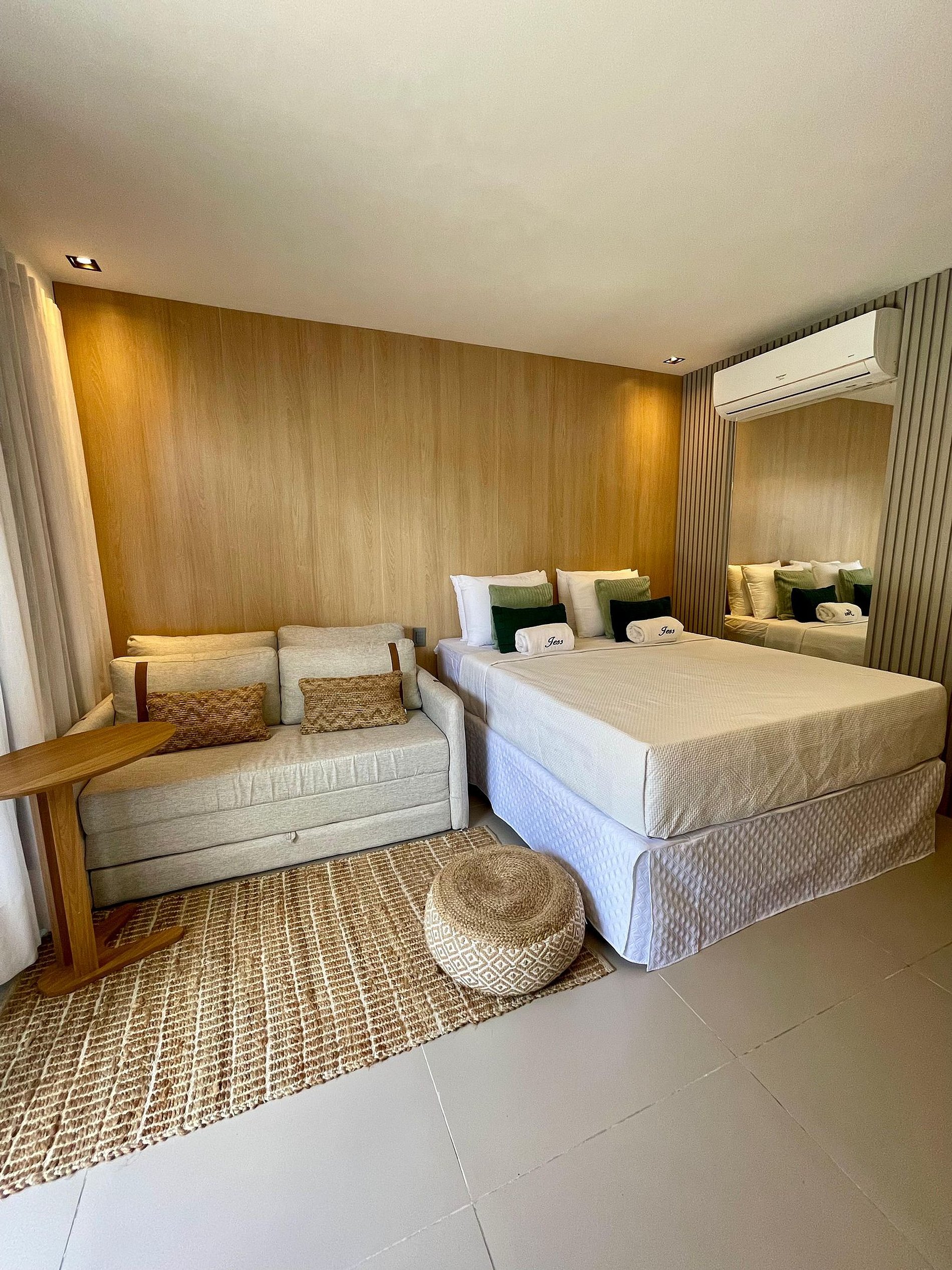 O apartamento é completo, com cama super confortável e sofá-cama e uma pequesna varanda. Cozinha completa com geladeira, cooktop, microondas, e todos os utensílios básicos, para preparar suas refeições. Oferecemos também enxoval de qualidade completos para todo o período de sua estadia. Apartamento completo para que possam desfrutar das férias sem preocupações. Com a Jess Hospedagens, você irá se concentrar no melhor de suas férias, que é aproveitar as belezas de João Pessoa e da Paraíba.