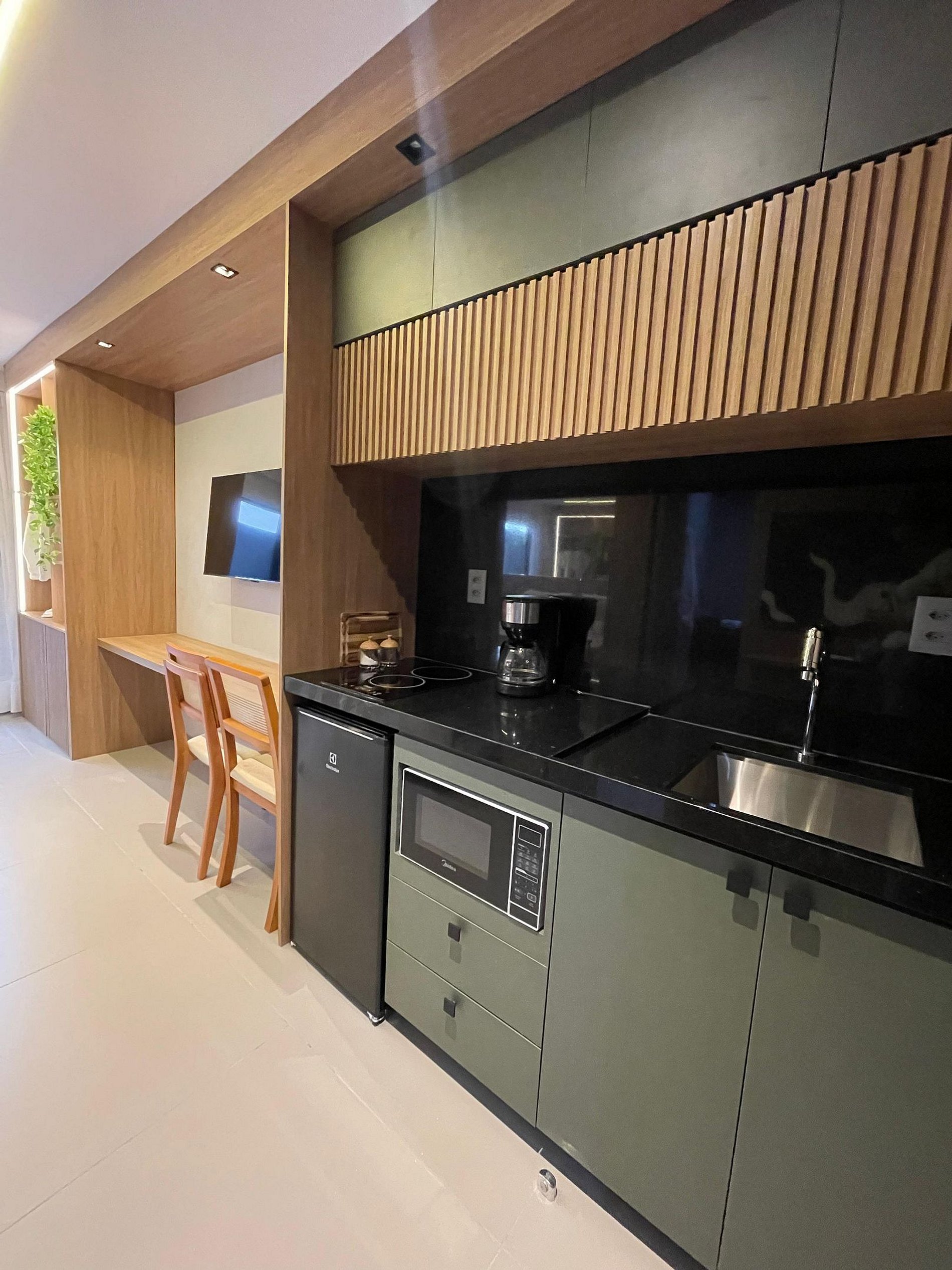 O apartamento é completo, com cozinha equipada (eletrodomésticos e utensílios) para preparar suas refeições com conforto.