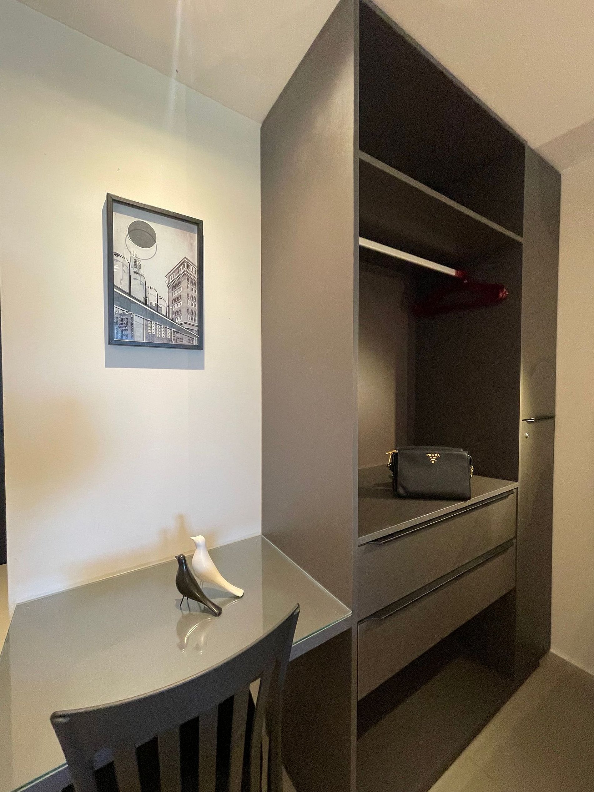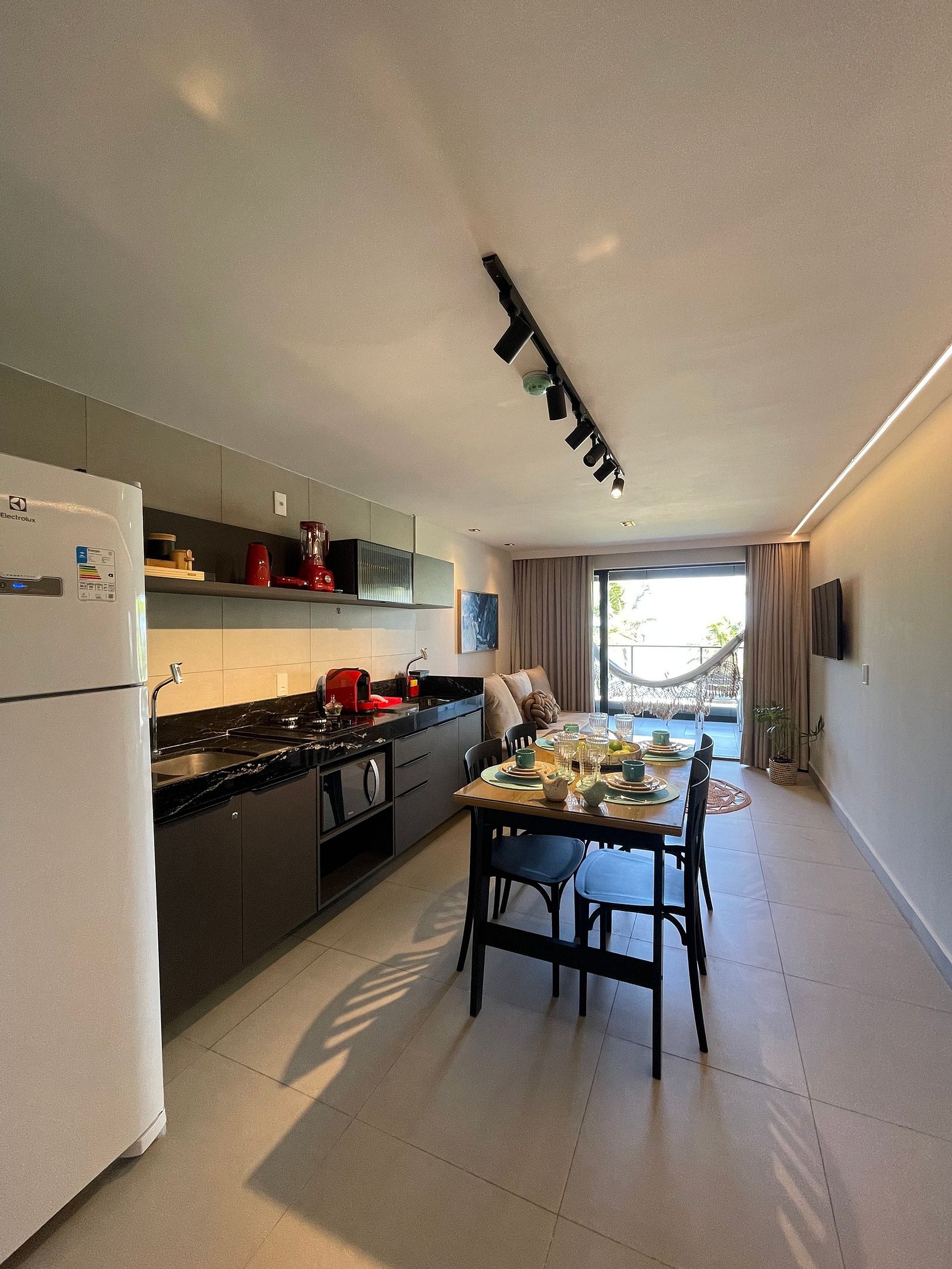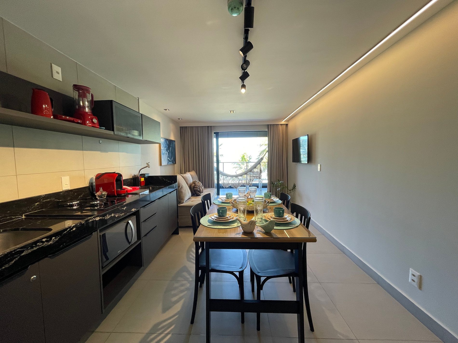 • Cozinha moderna e equipada, com cooktop, micro-ondas, cafeteira e utensílios essenciais para preparar desde um café rápido até um jantar completo.