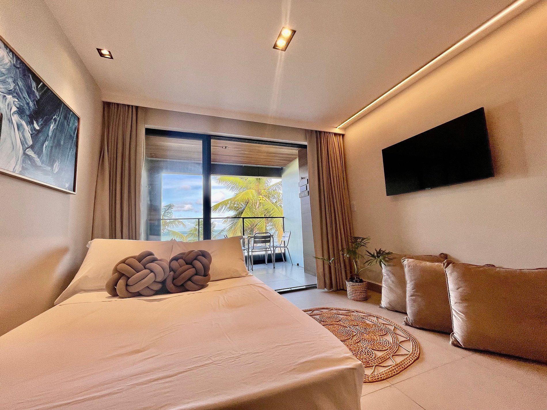 • Cama de casal confortável posicionada de frente para a TV e o mar, ideal para relaxar assistindo aos seus streamings favoritos.