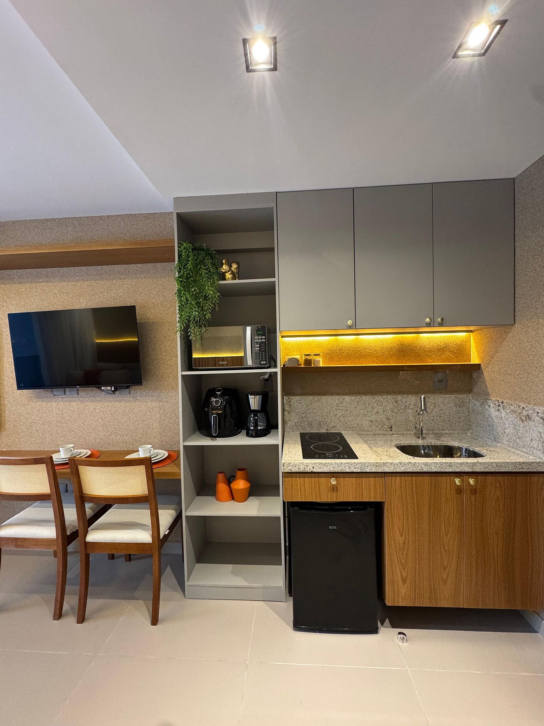 O apartamento é completo, com cozinha equipada (eletrodomésticos e utensílios) para preparar suas refeições com conforto.