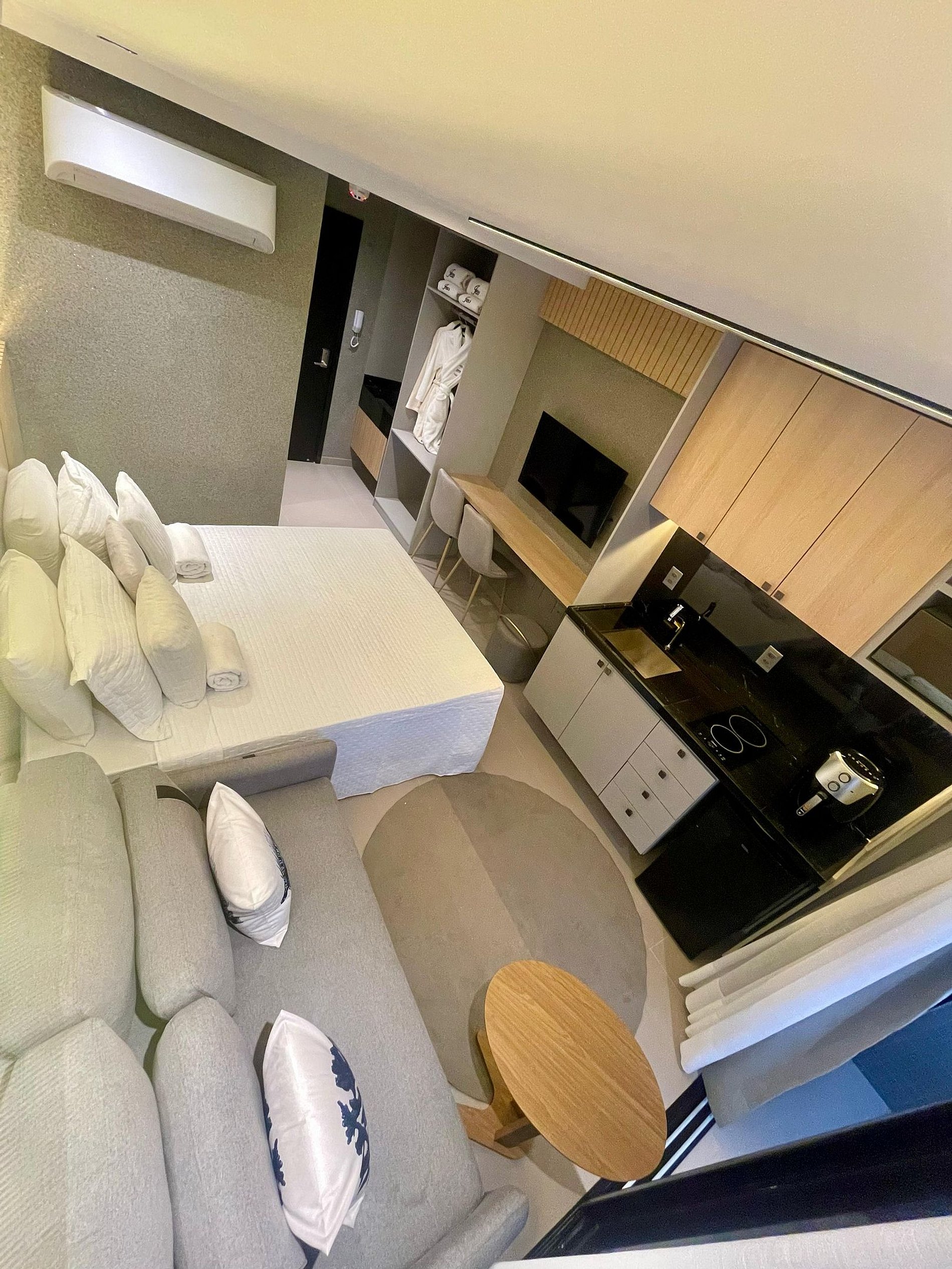 O apartamento é completo, com cama e sofá-cama super confortável e uma pequena varanda. Cozinha compacta e funcional.