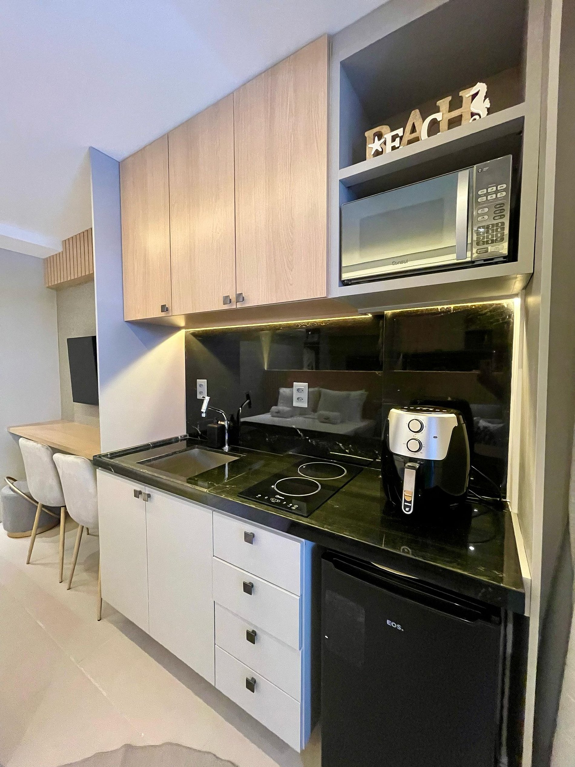 O apartamento é completo, com cozinha equipada (eletrodomésticos e utensílios) para preparar suas refeições com conforto.