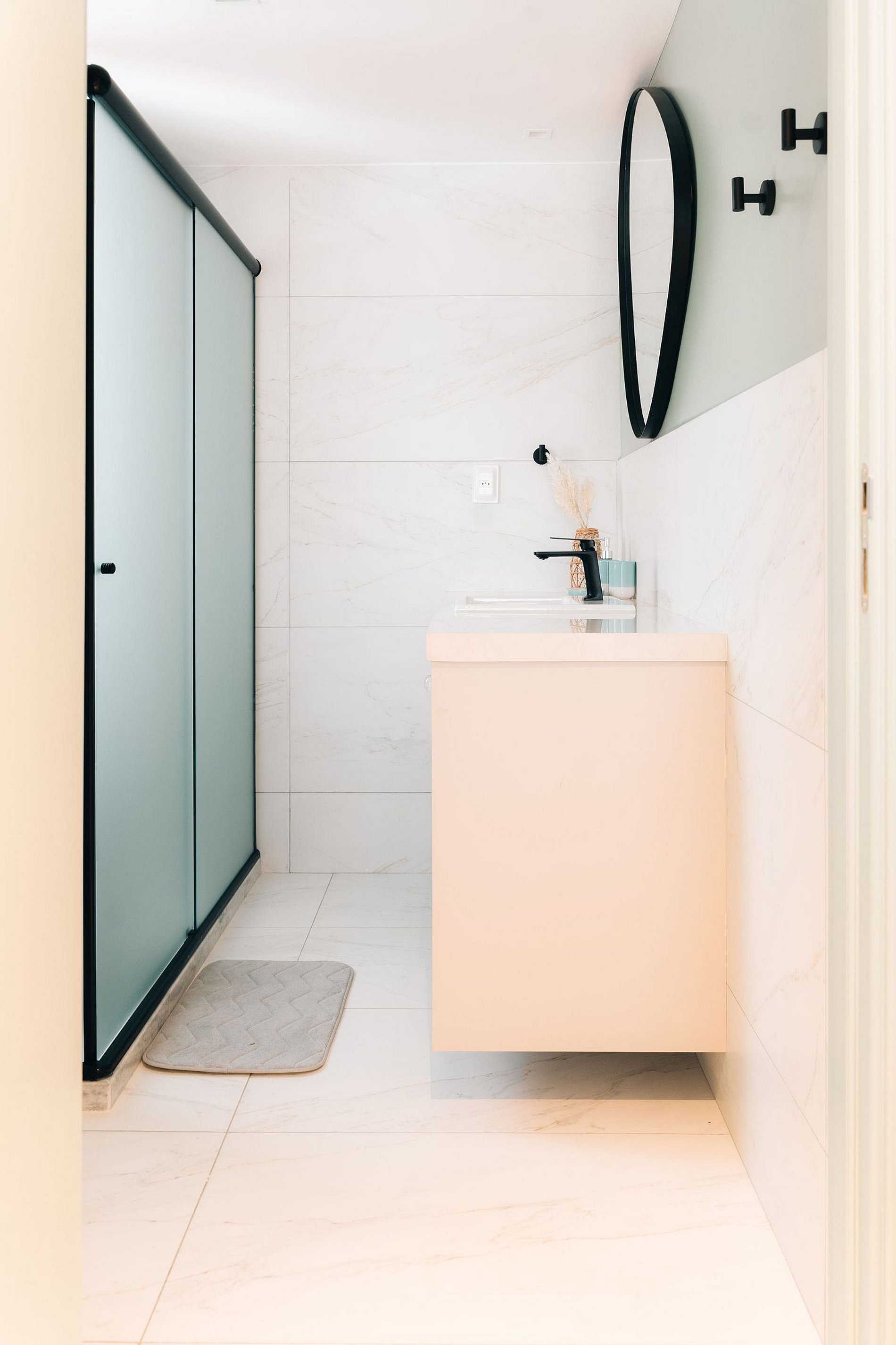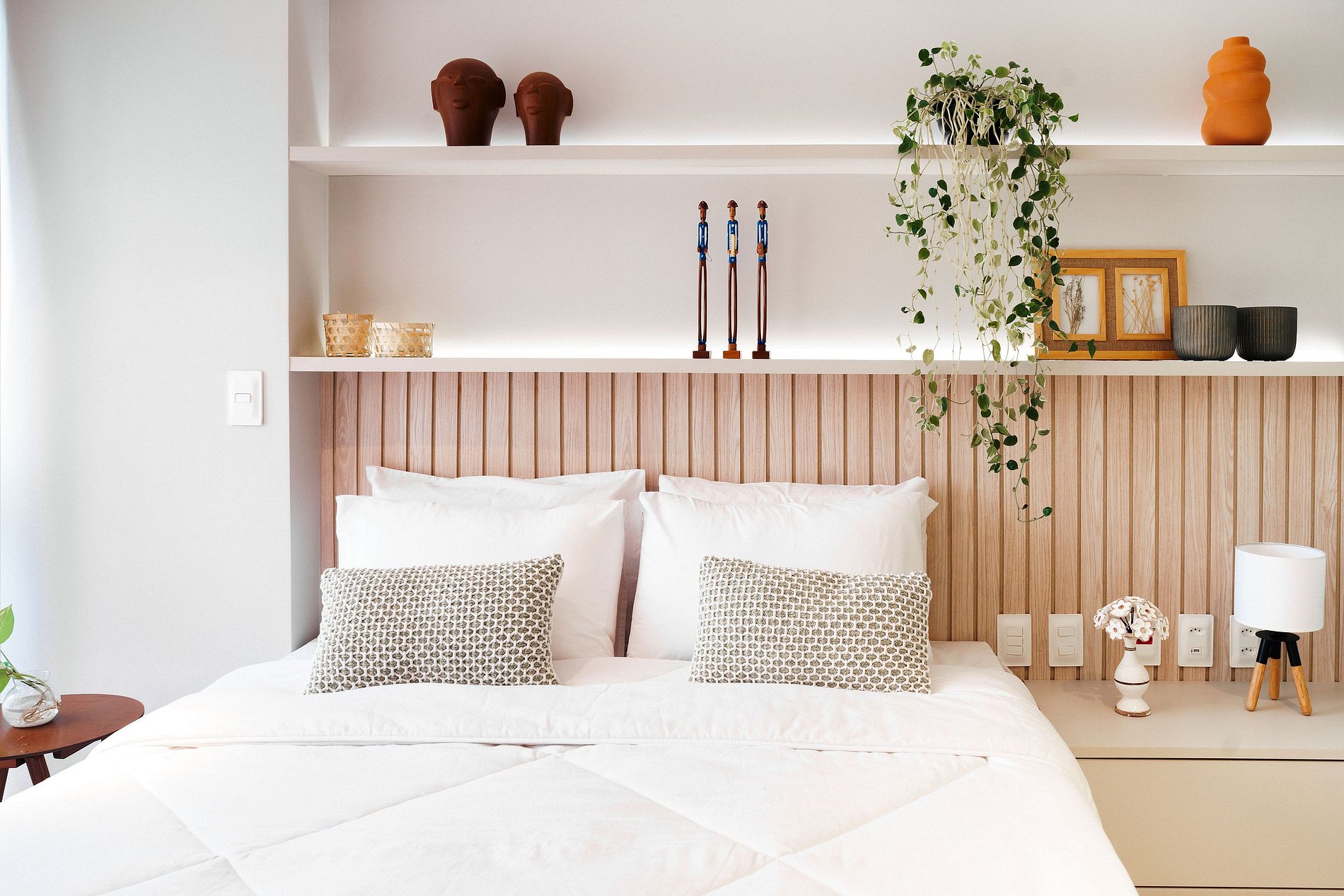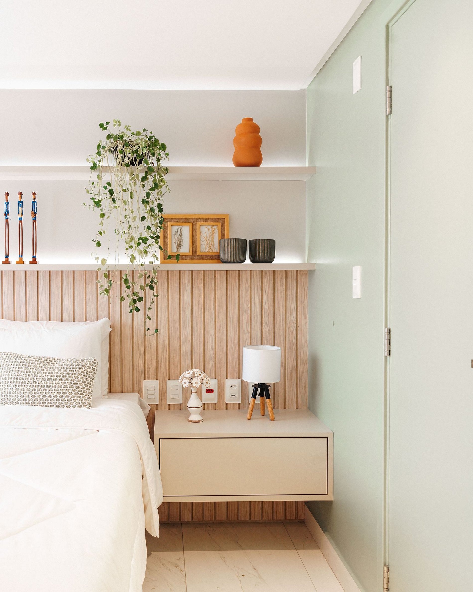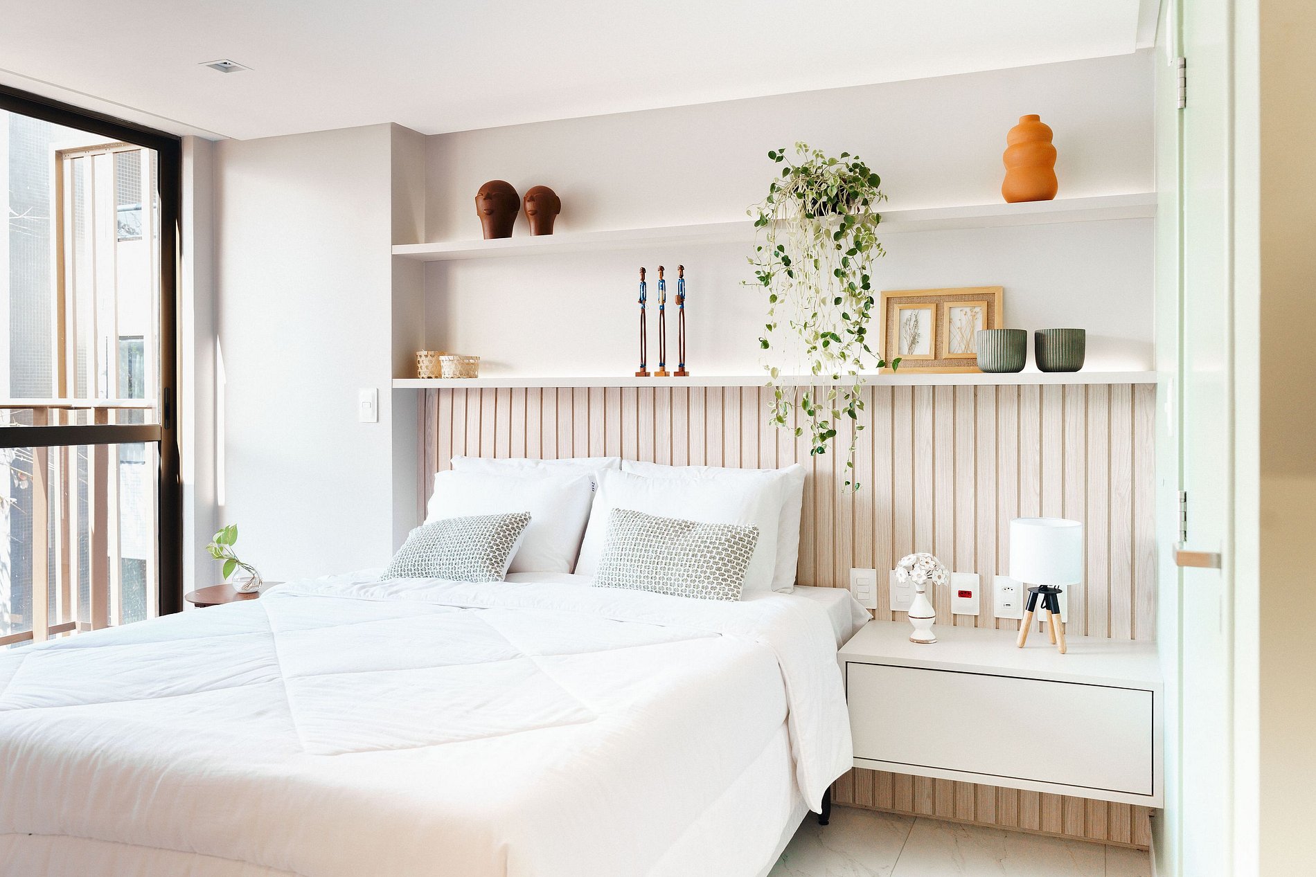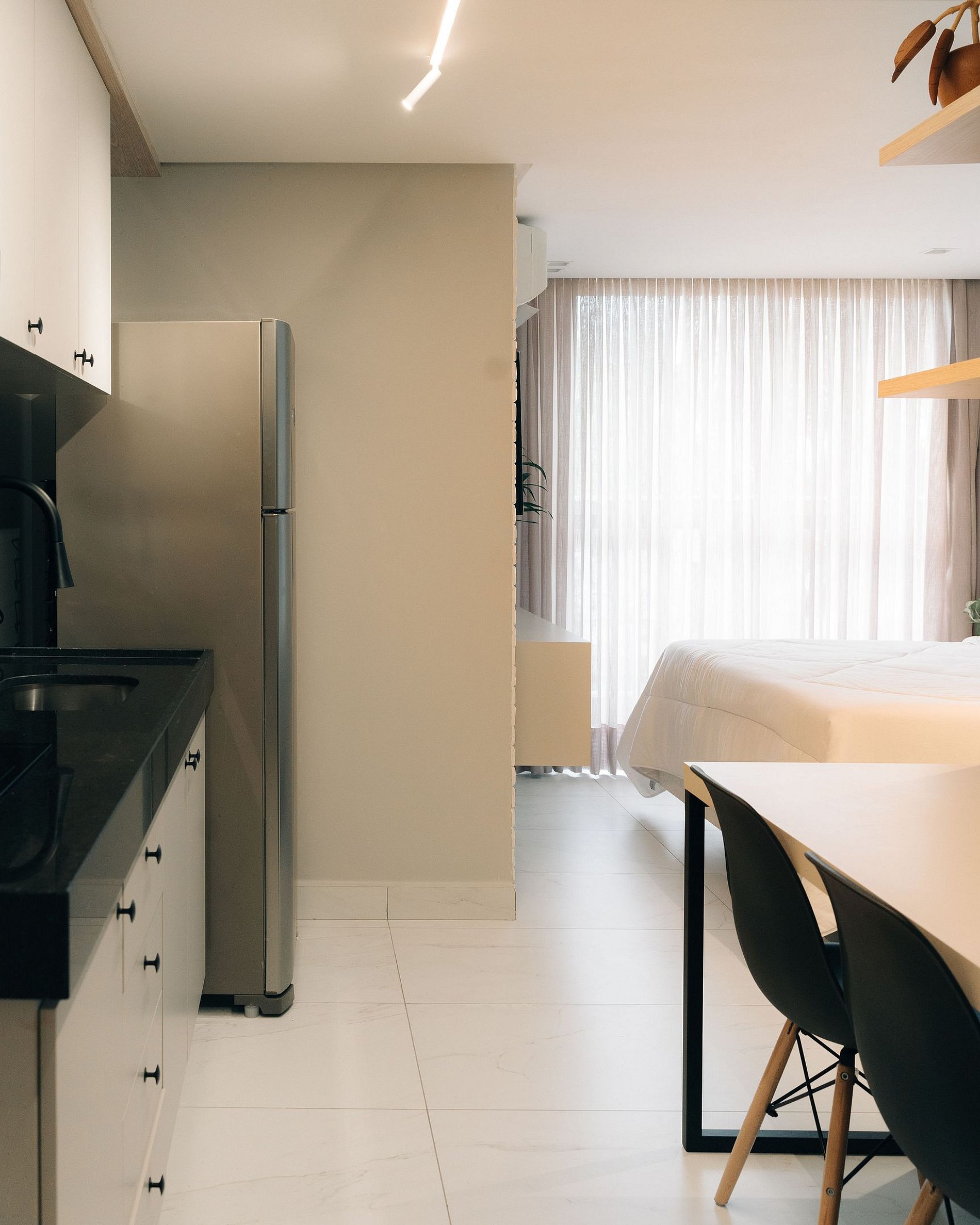 - O flat é super funcional com uma cama queen, guarda-roupa, mesa de apoio.