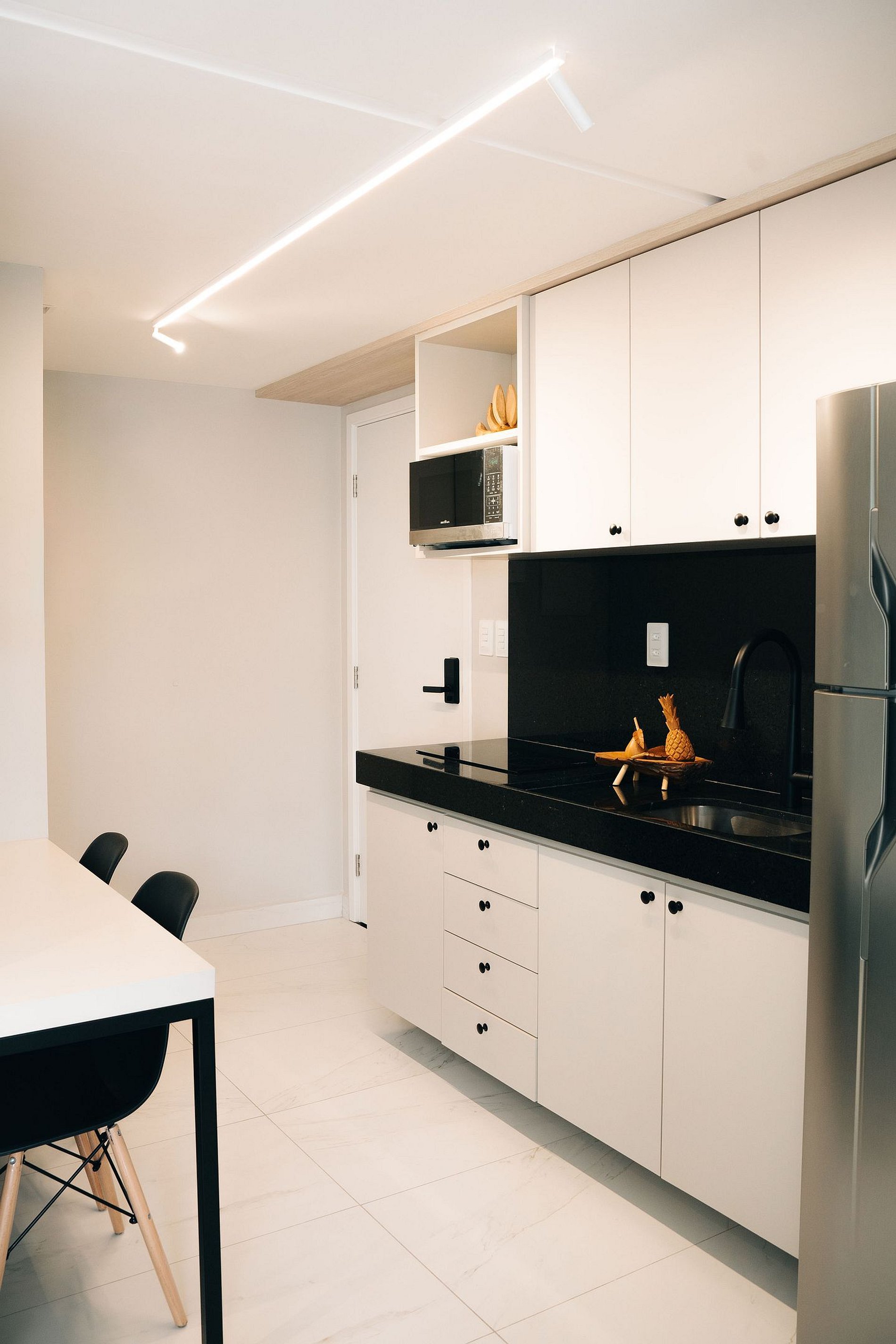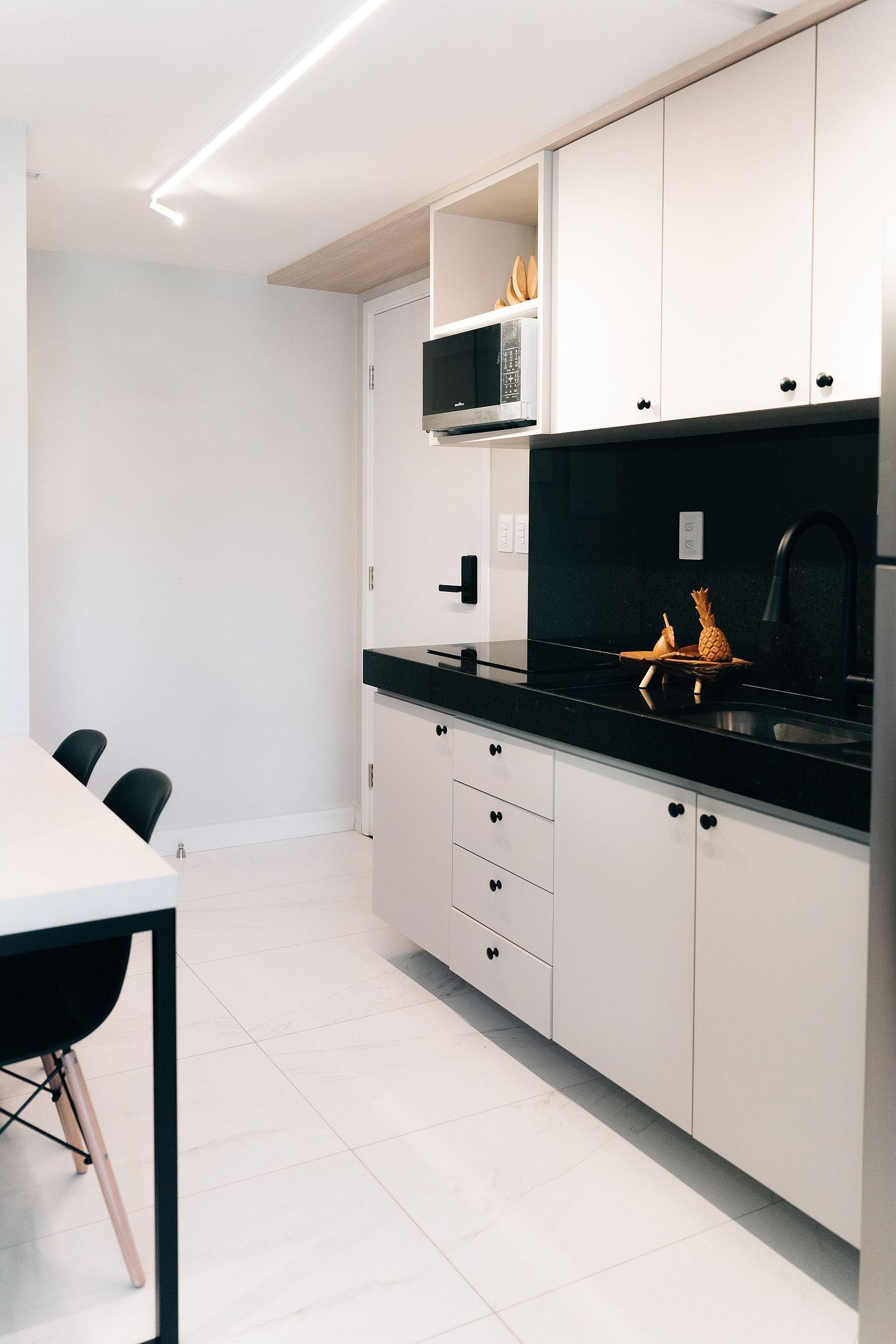 - A cozinha com todos os utensílios, louças charmosas, cafeteira elétrica, cooktop, micro-ondas etc.