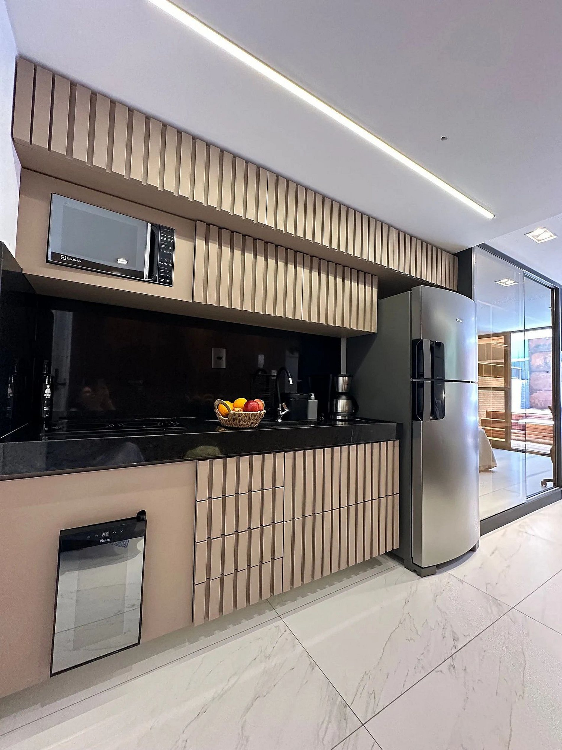 - A cozinha super funcional com todos os utensílios, louças charmosas, cafeteira elétrica, cooktop, micro-ondas etc.