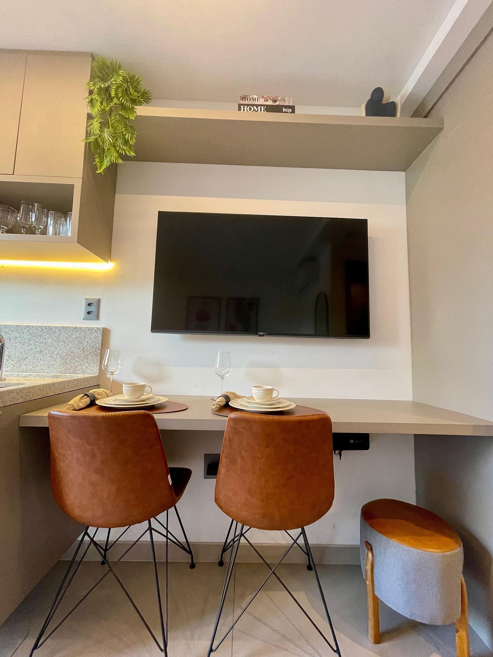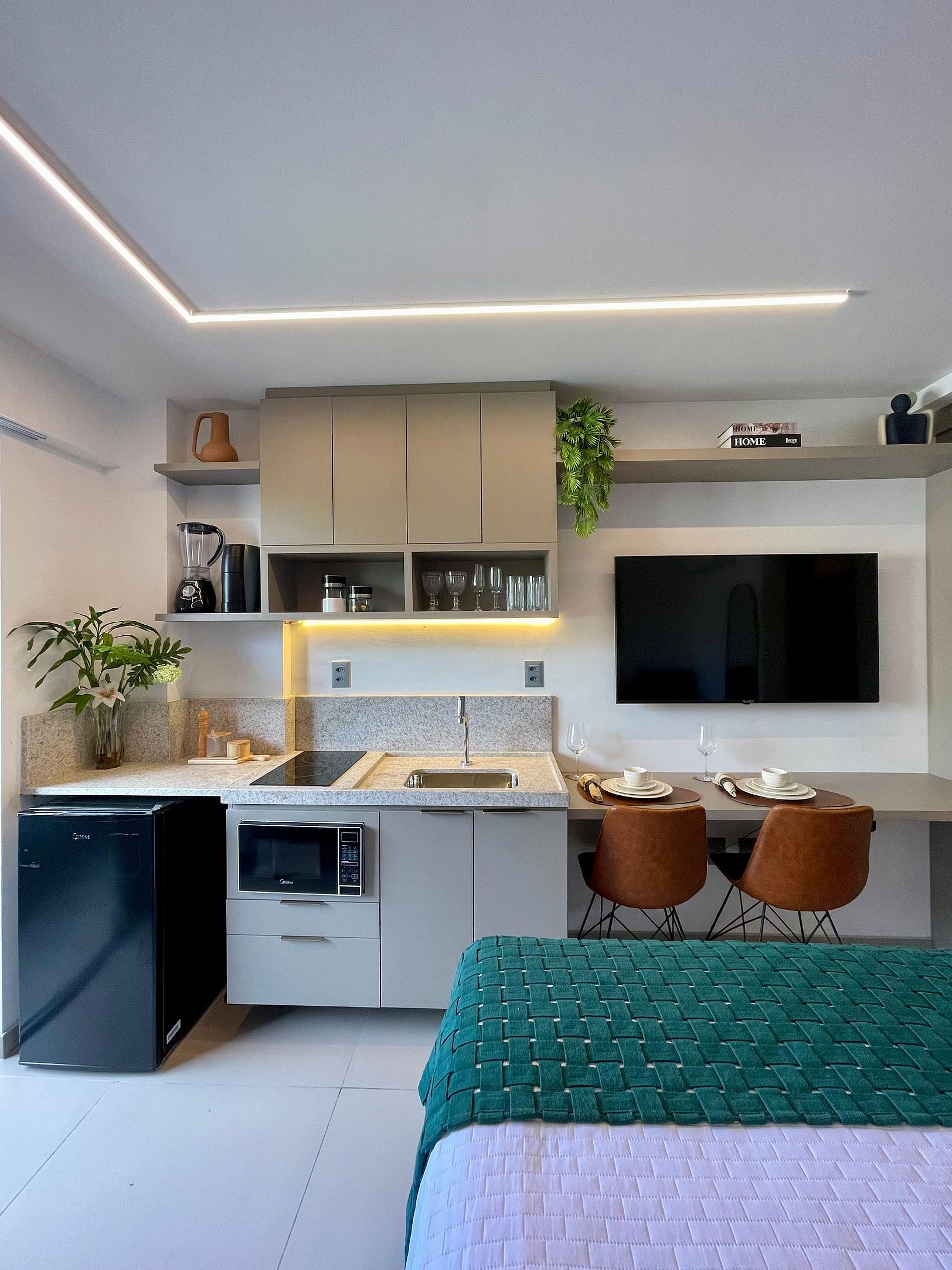 • Cozinha compacta e funcional, equipada com utensílios básicos para preparar suas refeições com praticidade