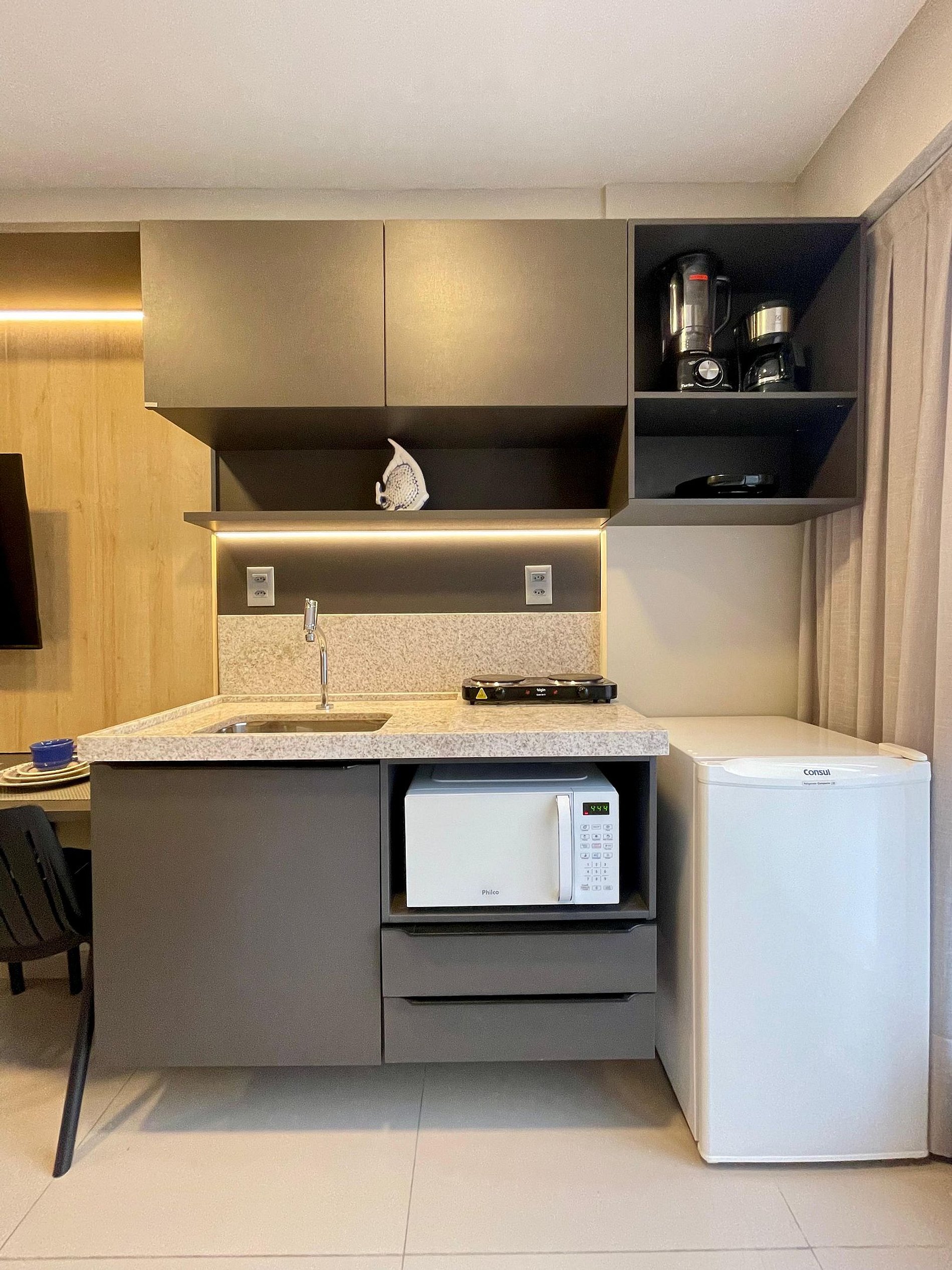 Aconchegante e funcional, este apartamento beira-mar acomoda até 3 pessoas com conforto e praticidade. A cozinha é compacta, mas bem equipada, ideal para quem deseja preparar refeições durante a estadia.