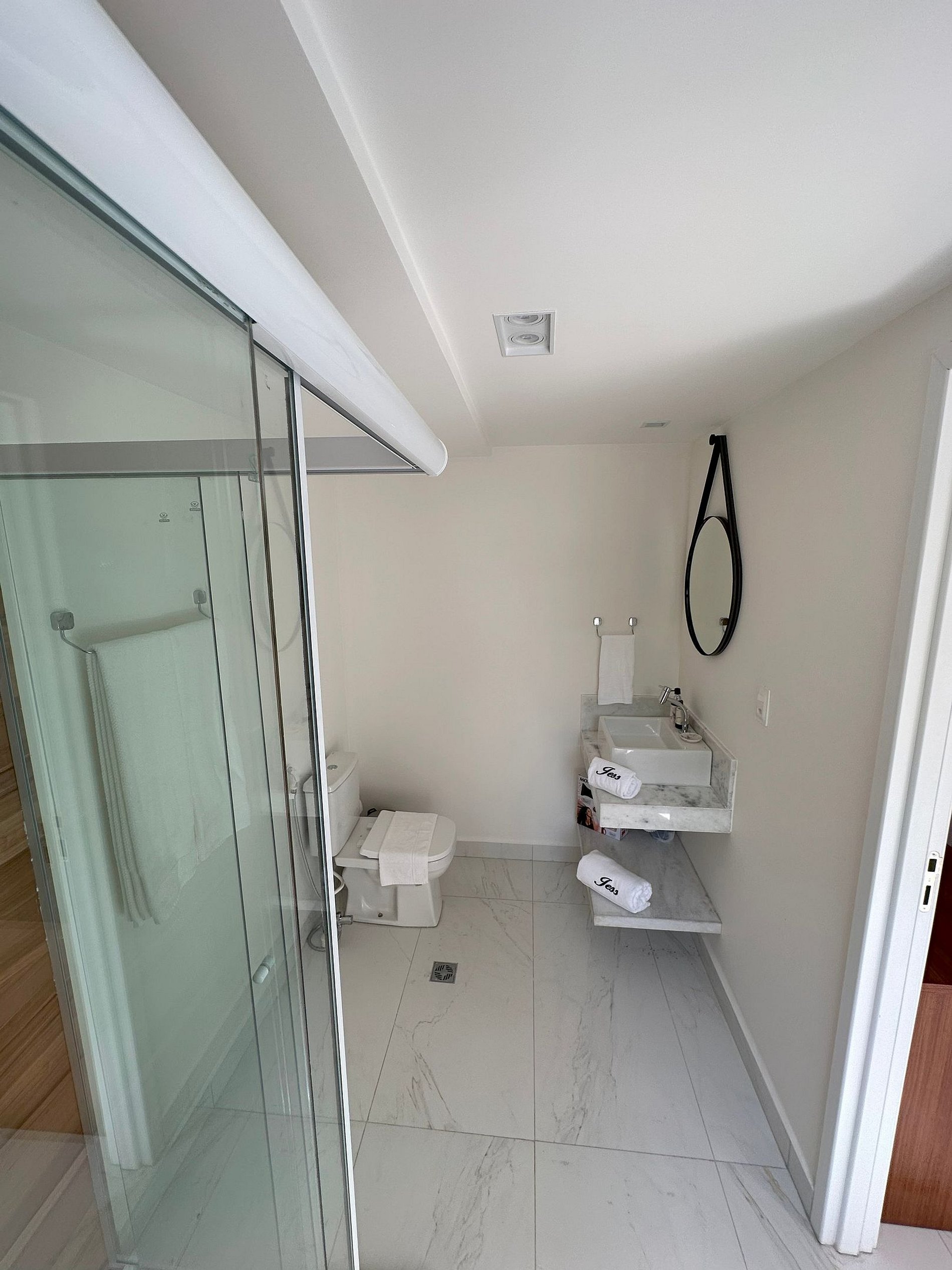 - O flat é super funcional com uma cama queen e sofá cama, guarda-roupa, mesa de apoio.